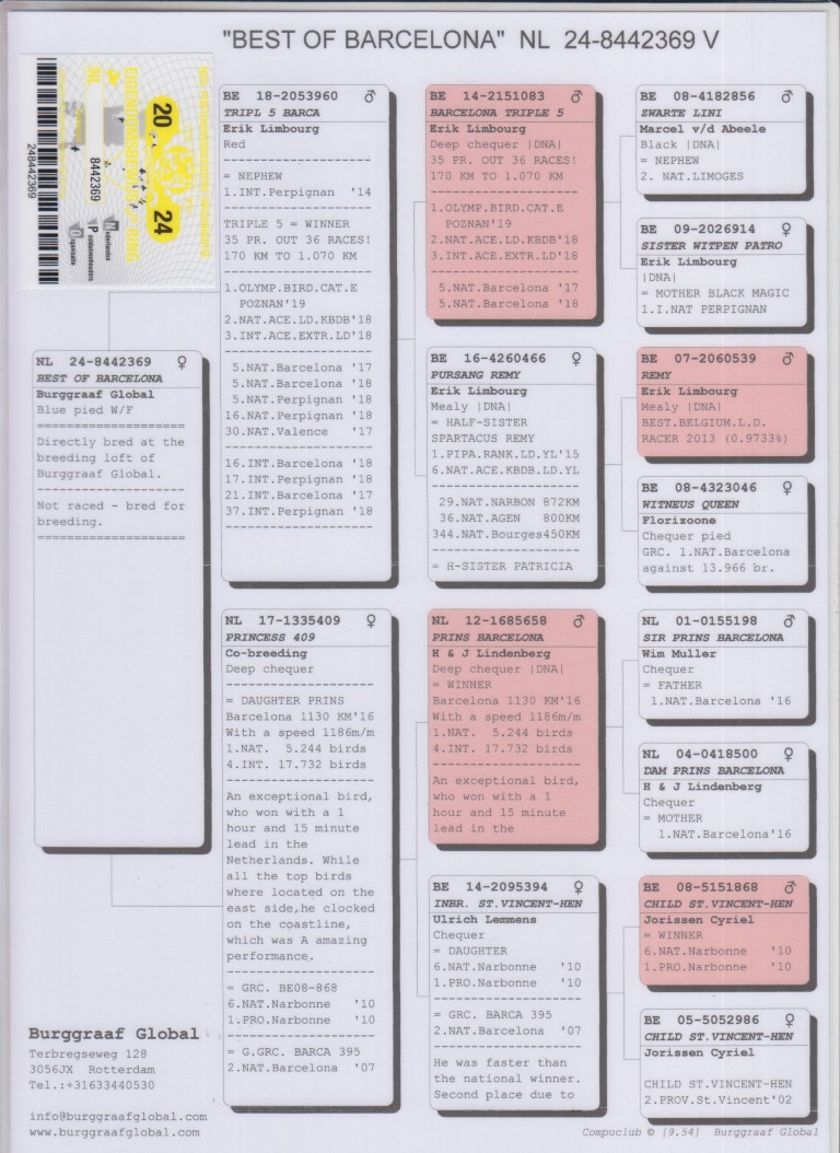 Uit: ”Triple 5 Barca”, zoon ”Barcelona Triple 5”, 1. Olympiade duif, 2. Nat. Asduif KBDB, 3. Int. Asduif, 5. Nat. Barcelona, 5. Nat. Barcelona, 5. Nat. Perpignan x ”Princess 409”, dtr. ”Prins Barcelona”, 1. Nat. Barcelona