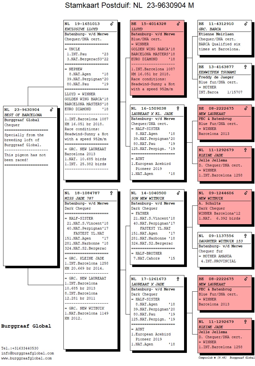 Uit: ”Exclusive Lloyd”, zoon ”Lloyd”, 1. Int. Barcelona 16.051 d., klz. ”New Laureaat” & ”Keline Jade” x ”Miss Jade 787”, kld. ”New Witbuik”, ”New Laureaat” & ”Kleine Jade” !!!!!!!!!!!!!!