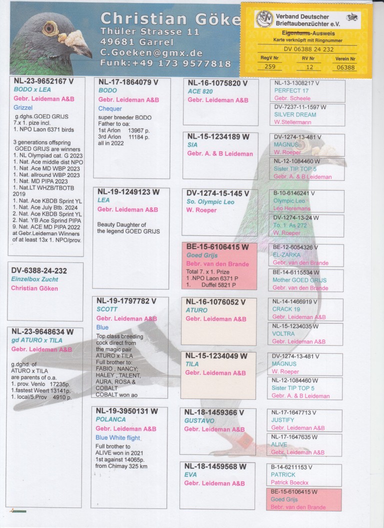 Uit: ”Bodo x Lea”, Gebr. A. & B. Leideman, uit dochter ”Goed Grijs”, uit zoon ”Ace 820” x ”Grdtr. Arturo x Tila”, Gebr. A. & B. Leideman, uit zoon ”Arturo” & ”Tila”, Stamkoppel, uit dtr. ”Gustavo” & ”Eva”, dtr. ”Goed Grijs”