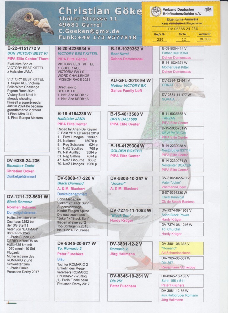 Uit: ”Son Victory Best Kittel”, zoon ”Victory Best Kittel”, 1. Super Asduif OLR Victoria Falls & zoon ”Best Kittel”, 1. & 4. Nat. Asduif Sprint KBDB x ”Black Romario”, uit kld. ”Romario”, Unieke OLR kweker Hans-Jörg Hallmann