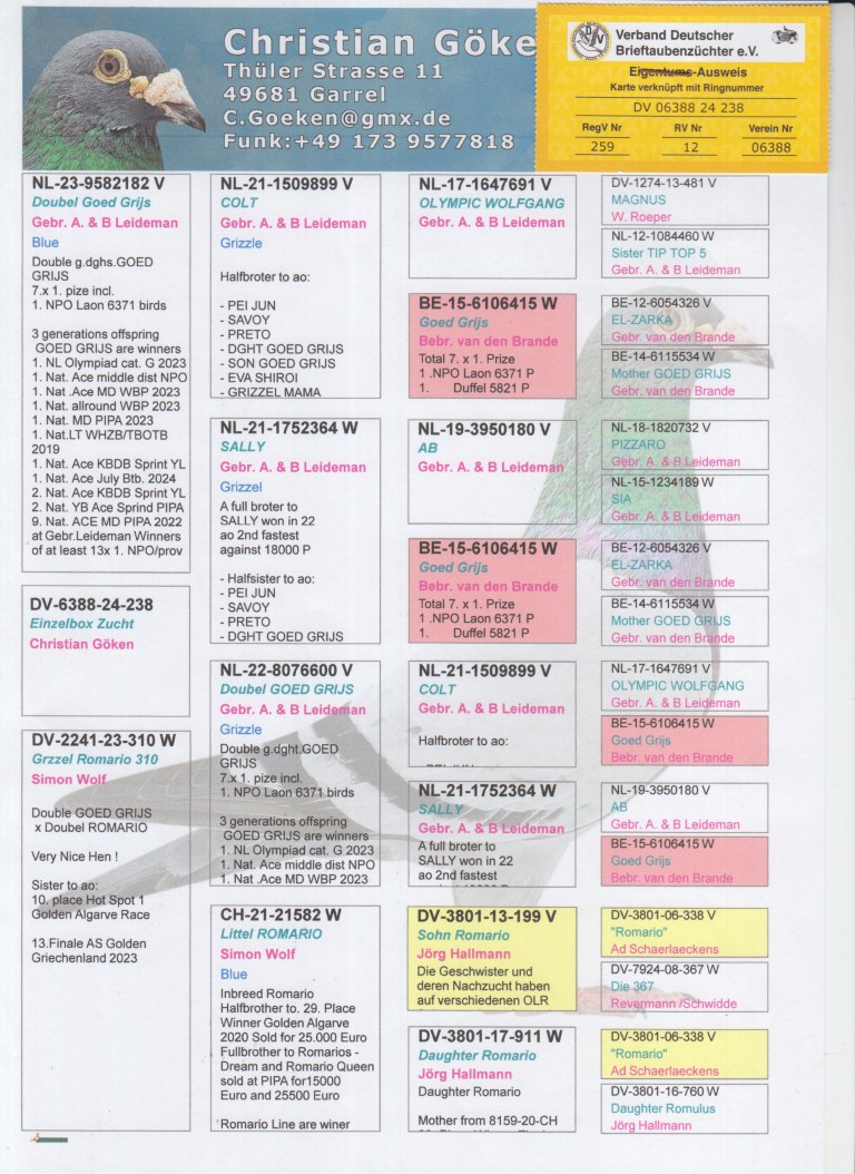 Uit: ”Doubel Goed Grijs”, uit zoon & dochter ”Goed Grijs”, 7x 1. Prijs & 1. NPO Laon 6.371 d., nazaten 7x 1. Nat. Asduif x ”Grizzel Romario”, uit inteelt dochter ”Romario”, Unieke OLR kweker, uit dubbele klz. ”Goed Grijs”