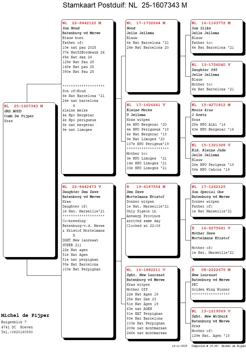 Uit: ”Son Noud”, vader 10. Nat. Pau, 37. Nat. Bordeaux, 65. Nat. Dax, zoon ”Noud”, 2. Int. Asduif Barcelona & ”Kleine Mieke”, 4.-4.-6.-9. NPO x ”Daughter Den Dave”, dochter ”Den Dave”, 1. Nat. Marseille (Geklokt 22.06)