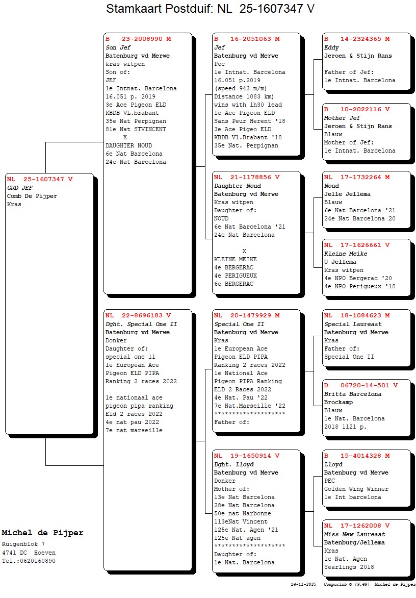 Uit: ”Son Jef”, zoon ”Jef”, 1. Int. Barcelona, uit dochter ”Noud”, 2. Int. Asduif Barcelona x ”Dht. Special One II”, 1/2 zus 13. & 28. Nat. Barcelona, dochter ”Special One II”, 1. Int. Asduif Int. Vluchten, 1. Nat. Asduif 2 Vluchten