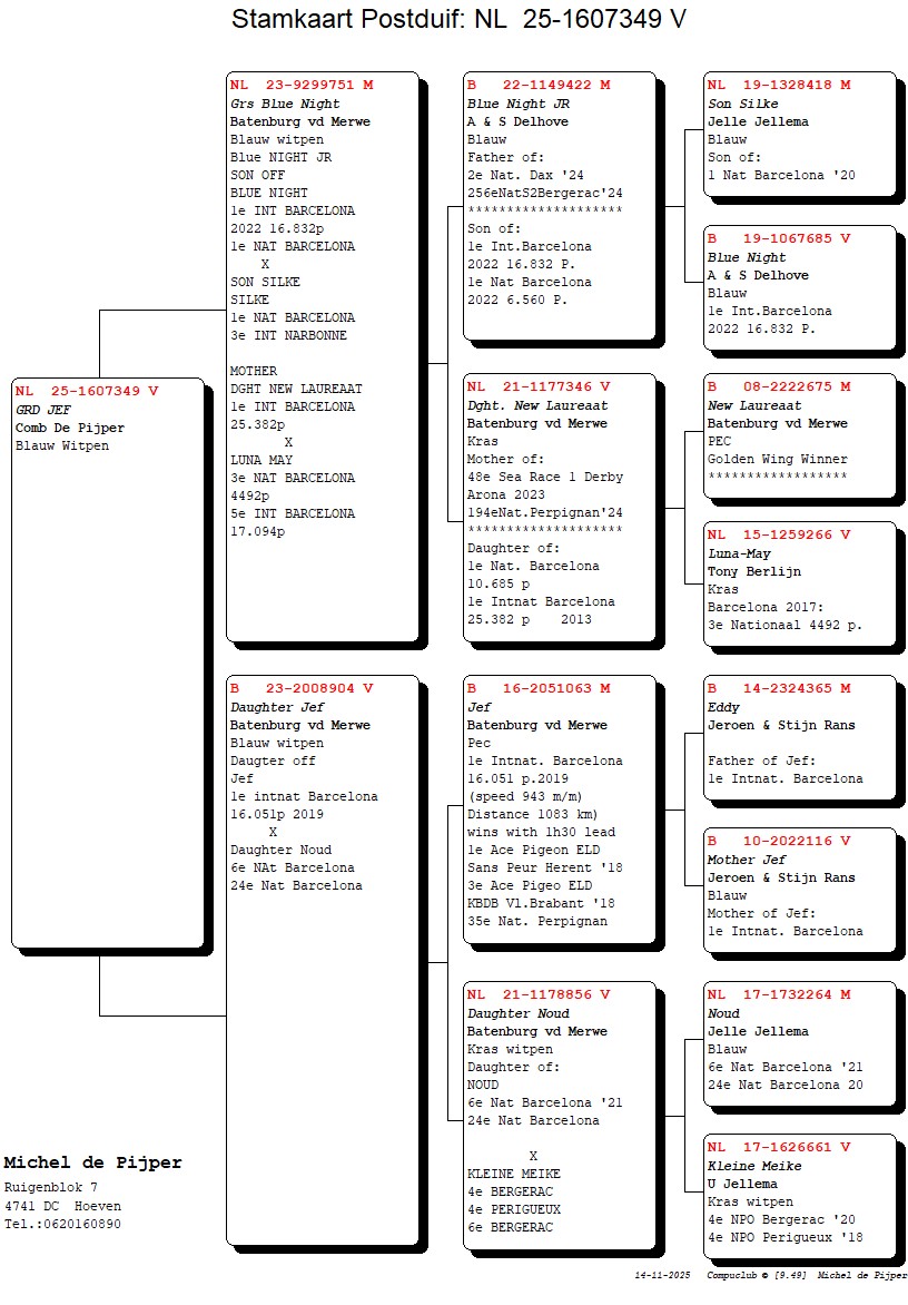 Uit: ”Grs. Blue Night Jr.”, broer 2. Nat. Dax, uit zoon ”Blue Night Jr.”, 1. Int. Barcelona, uit dochter ”New Laureaat”, 1. Int. Barcelona x ”Daughter Jef”, dtr. ”Jef”, 1. Int. Barcelona, uit dtr. ”Noud”, 2. Int. Asduif Barcelona