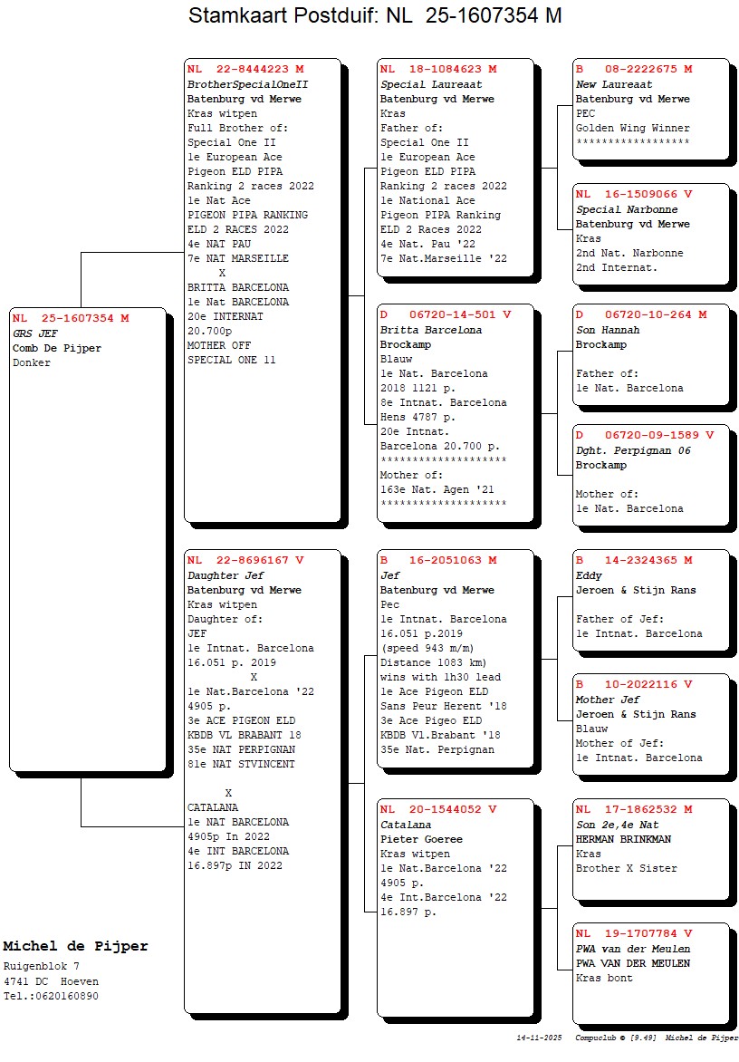 Uit: ”Brother Special One II”, broer ”Special One II”, 1. Int. Asduif Int. Vluchten, 1. Nat. Asduif, zoon ”Britta Barcelona”, 1. Nat. Barcelona x ”Dtr. Jef”, dtr. ”Jef”, 1. Int. Barcelona & ”Catalana”, 1. Nat. Barcelona