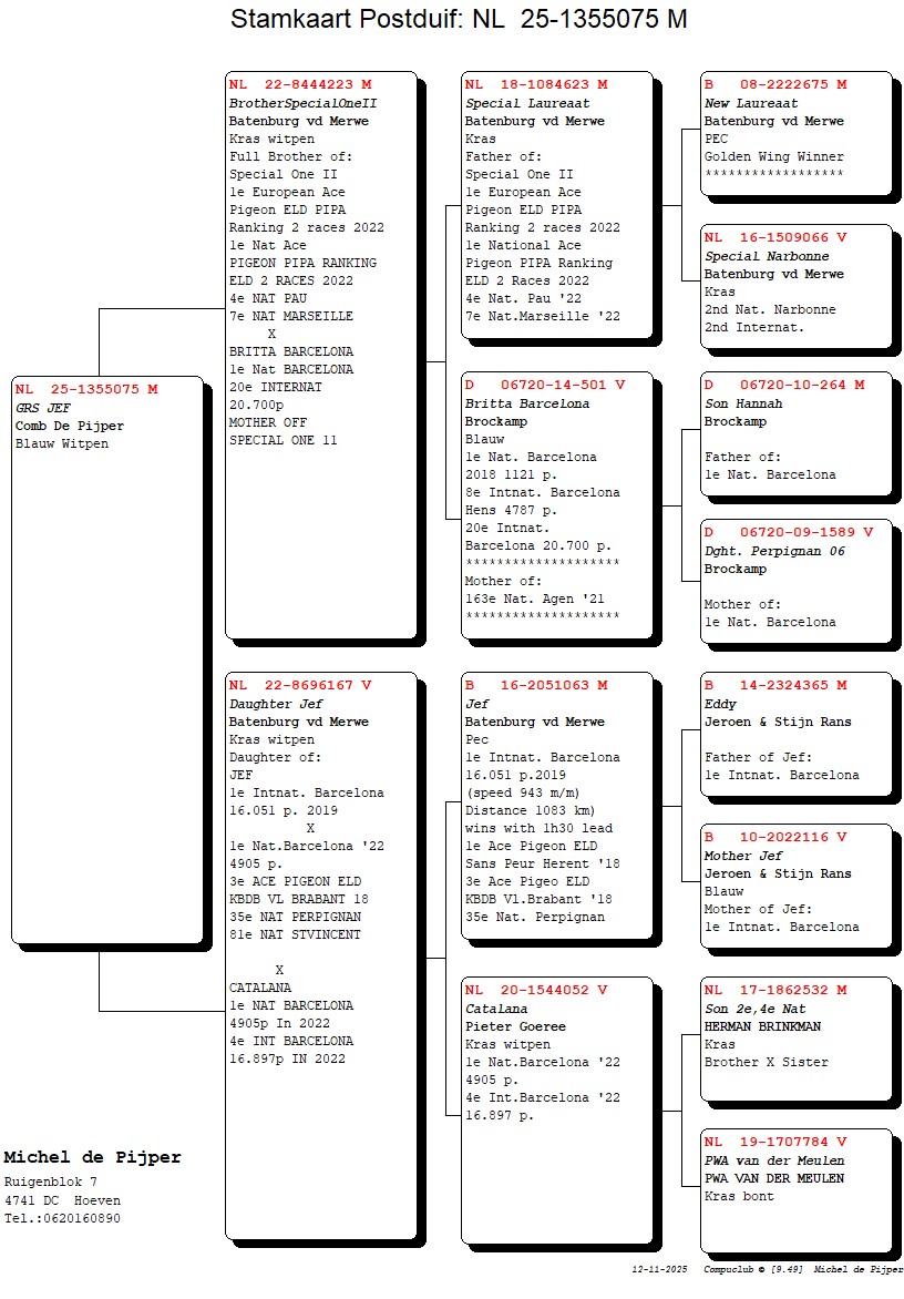Uit: ”Brother Special One II”, broer ”Special One II”, 1. Int. Asduif Int. Vluchten, 1. Nat. Asduif, zoon ”Britta Barcelona”, 1. Nat. Barcelona x ”Dtr. Jef”, dtr. ”Jef”, 1. Int. Barcelona & ”Catalana”, 1. Nat. Barcelona
