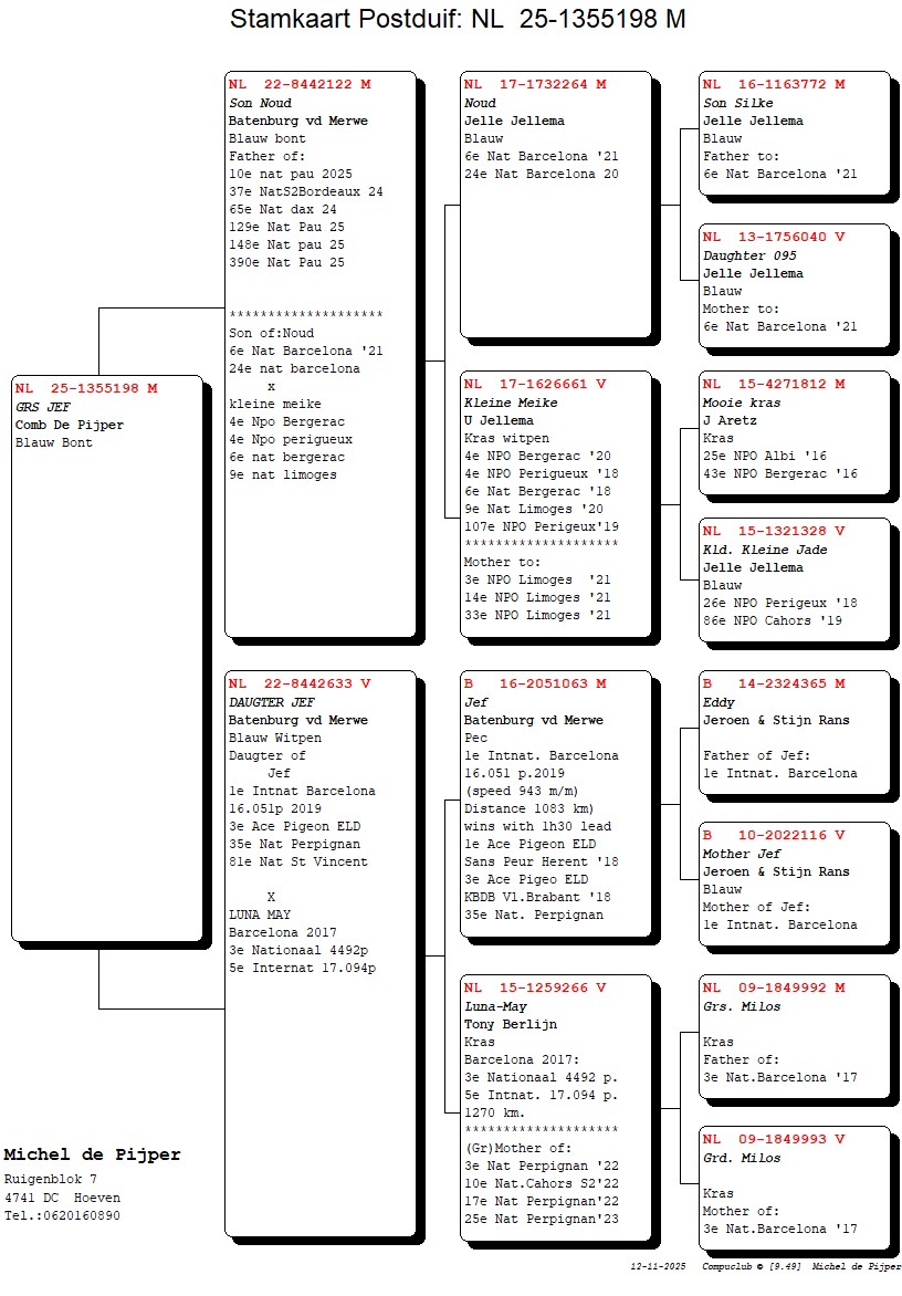 Uit: ”Son Noud”, vader 10. Nat. Pau, 37. Nat. Bordeaux, 65. Nat. Dax, zoon ”Noud”, 2. Int. Asduif Barcelona & ”Kleine Mieke”, 4.-4.-6.-9. NPO x ”Dtr. Jef”, dochter ”Jef”, 1. Int. Barcelona, dtr. ”Luna-May”, 5. Int. Barcelona