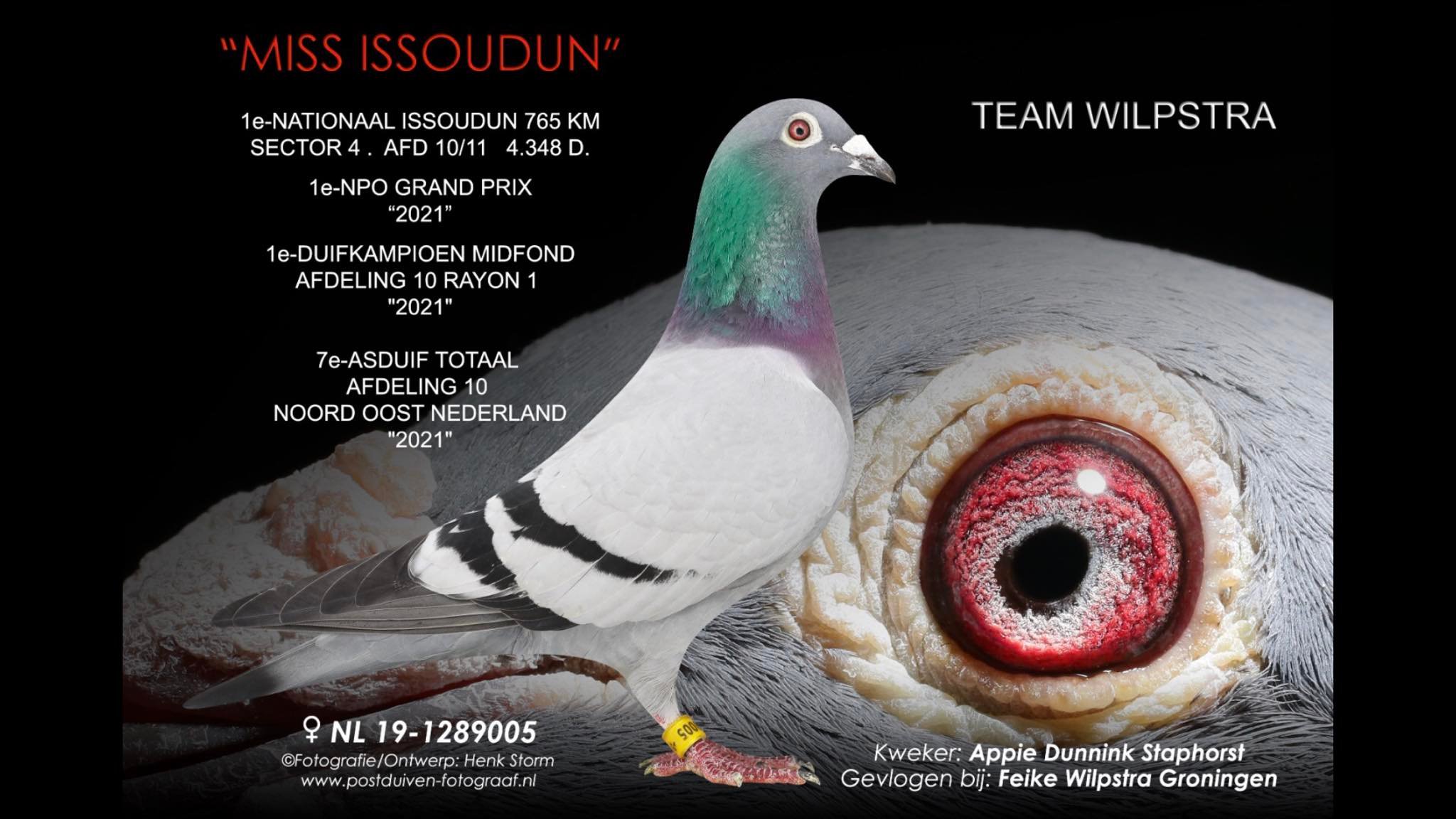 Uit: ”De 441”, uit broer ”Olympic Luna”, 2. Olympiade duif Sprint, 1. Nat. Asduif WHZB, uit dochter ”Häkkinen” x “The 538”, dochter “Harry Boy”, kl.zoon “Harry”, 1. Nat. Asduif Dagfond WHZB & “Sister Super Girl”