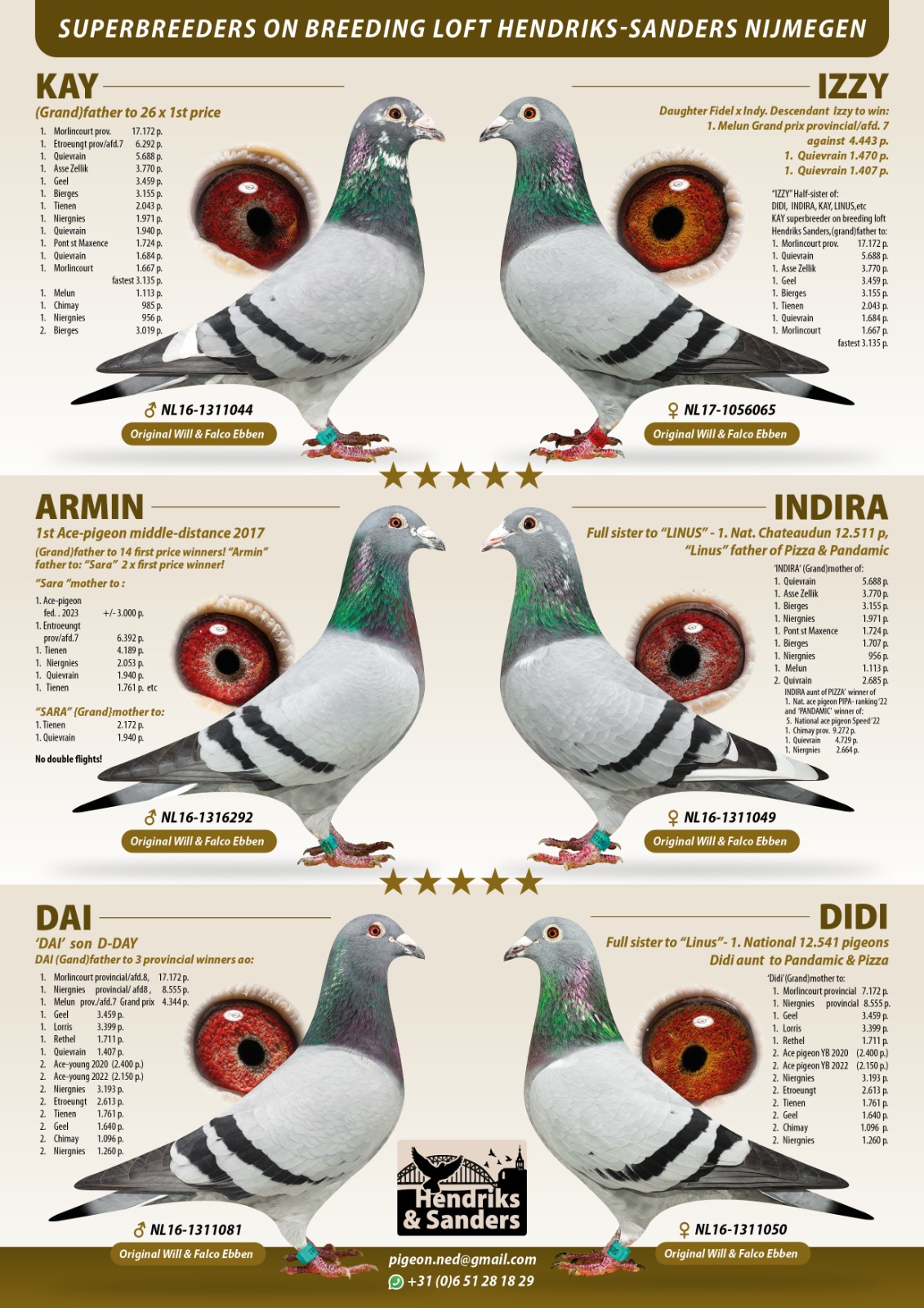 Uit: ”Nathan”, zoon ”Nanko”, 4. Asduif Federatie, 22. Nat. Asduif WHZB, zoon ”Naomie”, 1. Asduif Federatie, 20. Nat. Asduif x ”Joy”, zus ”Paulina”, 1. Prov. Morlincourt 6.385 d., 1. Semi-Prov. Asduif, moeder 1. Prov. 6.596 d.