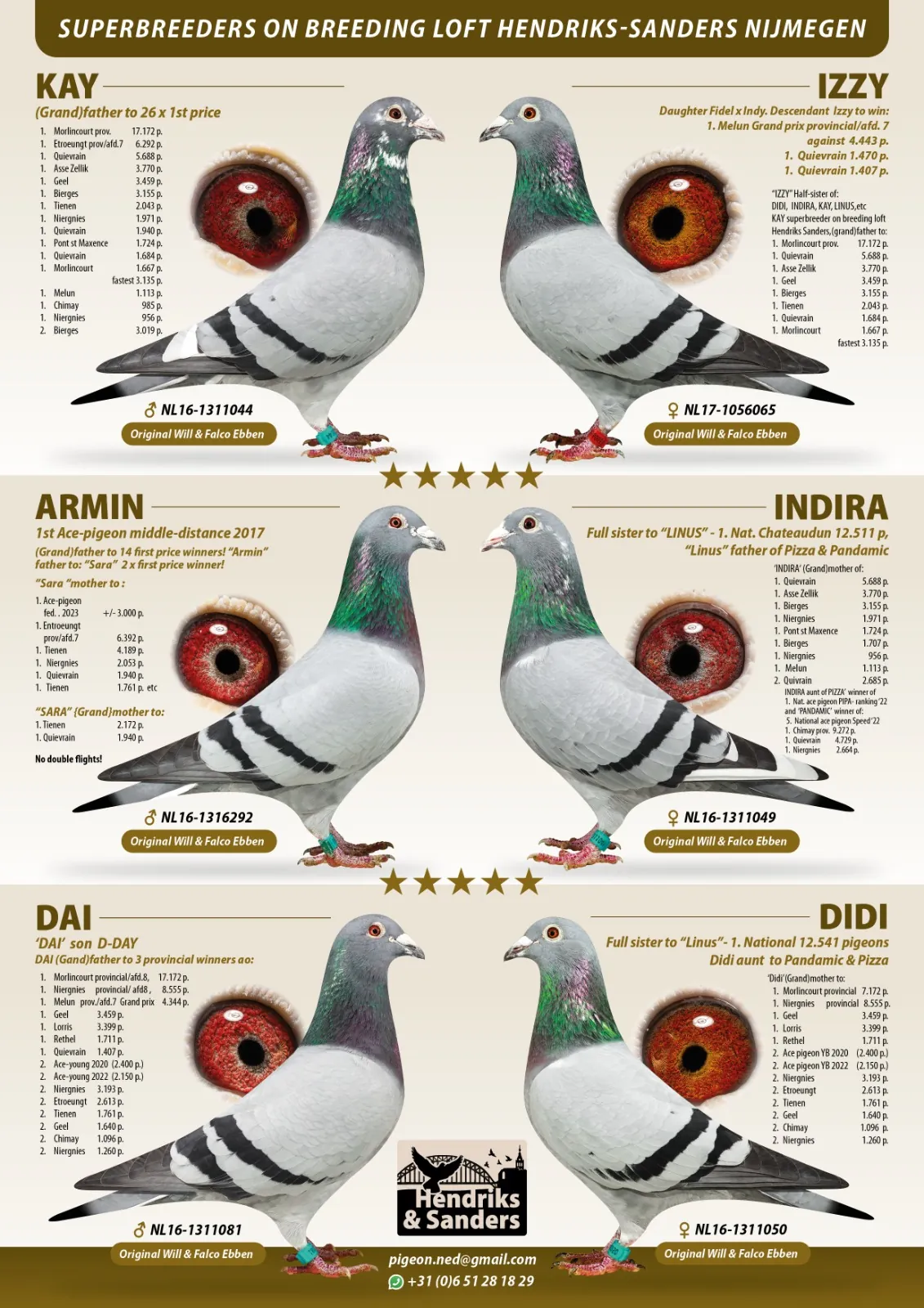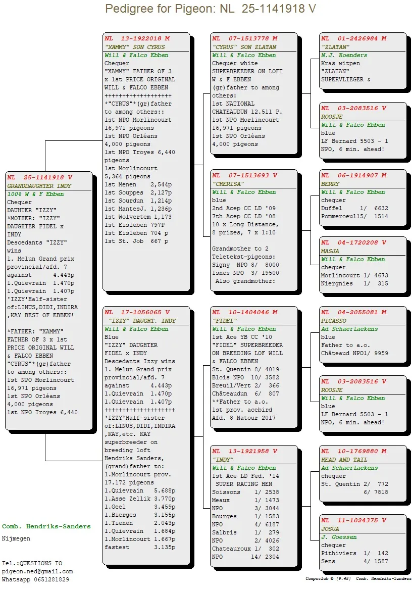 Uit: ”Xammy”, vader 3x 1. Prijs, zoon ”Cyrus”, nazaten: 3x 1. Olympiade, 16x 1. NPO winnaar, 6x 1. Asduif & (Halve) Finale OLR x ”Izzy”, nazaten: 1. Prov. GP 4.443 d., 1.-1.470 d., 1.-1.407 d., dochter ”Fidel” & ”Indy”