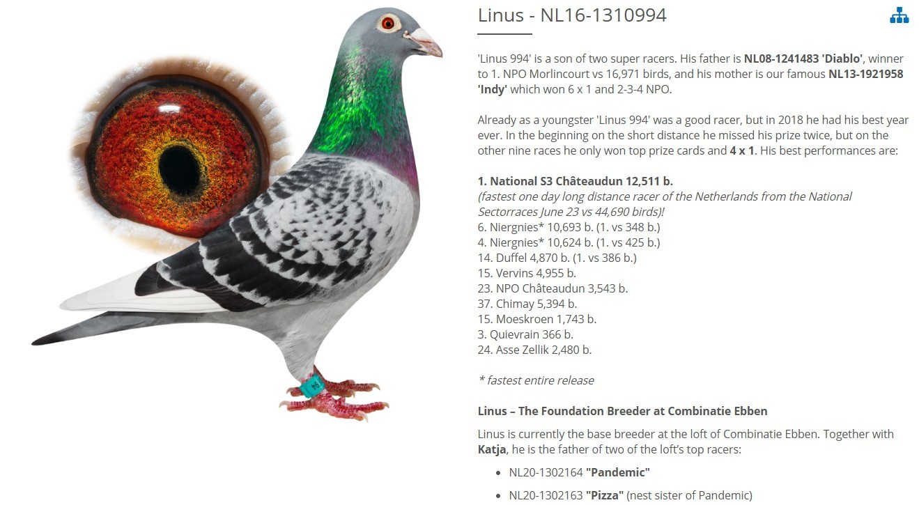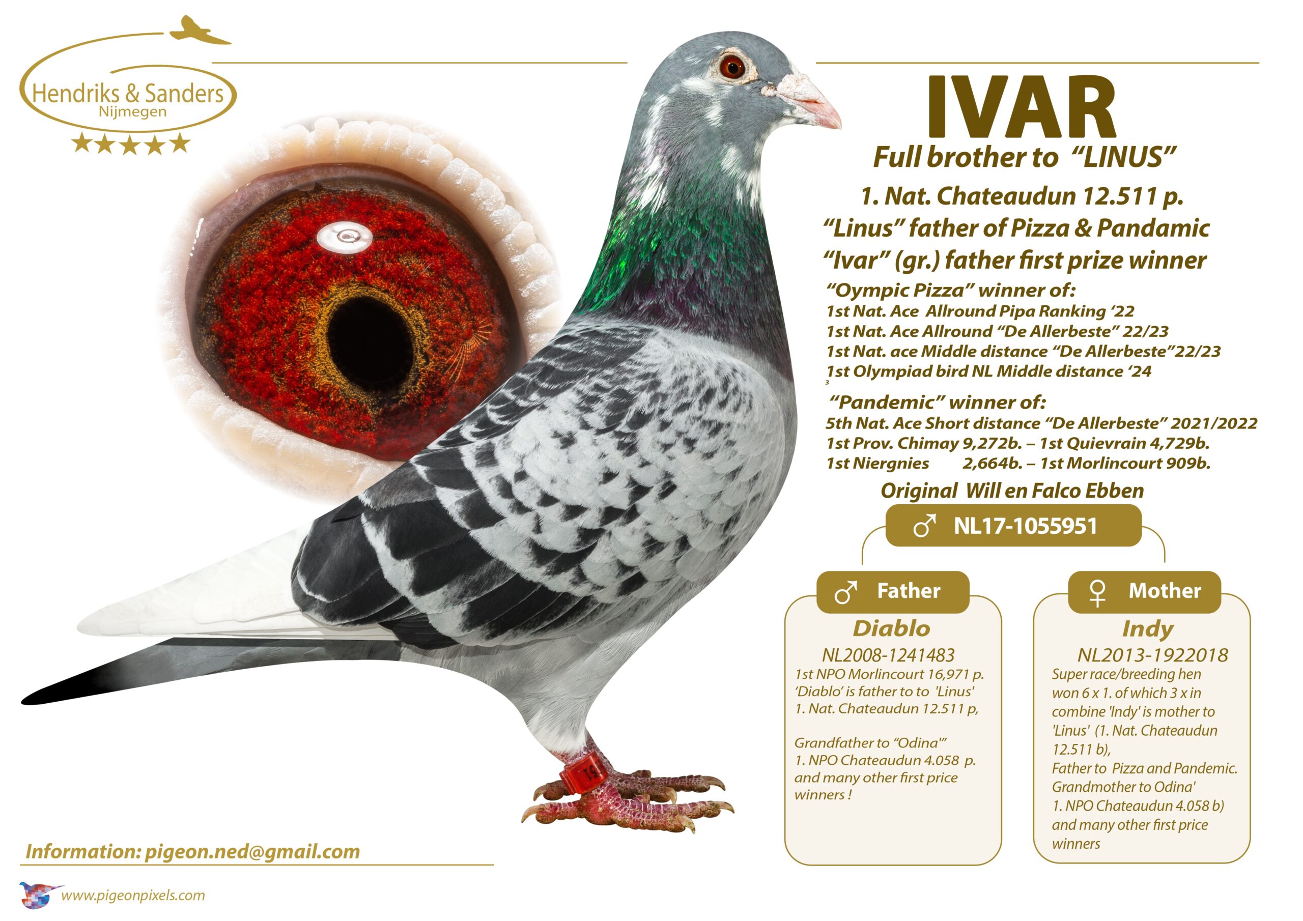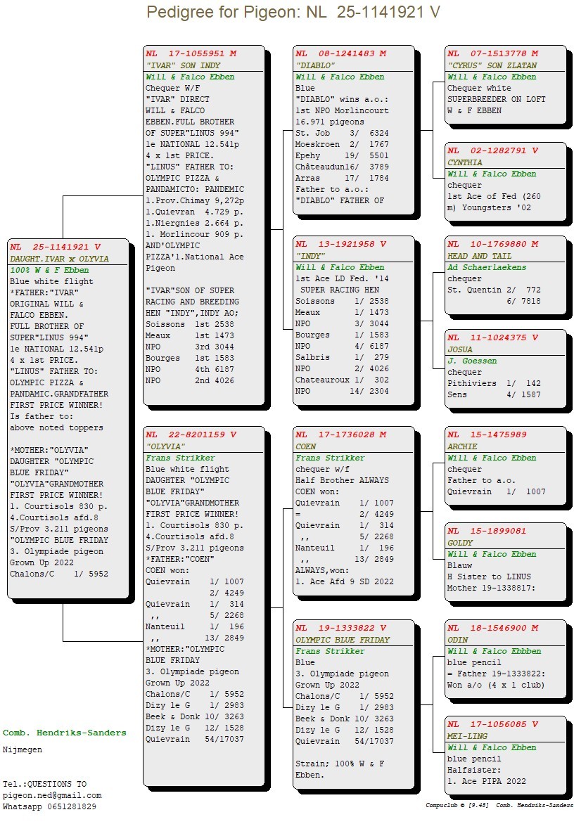 Uit: ”Ivar”, broer ”Linus”, 1. Nat. Chateaudun 12.541 d., stamvader Ebben & vader ”Olympic Pizza” & ”Pandemic” x ”Olyvia”, dochter ”Olympic Blue Friday”, 3. Olympiade duif Cat. Grown Up, dochter ”Coen”, 1.-1.007 d., 1.-314 d.