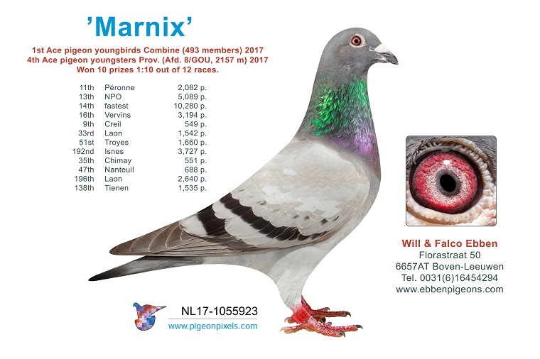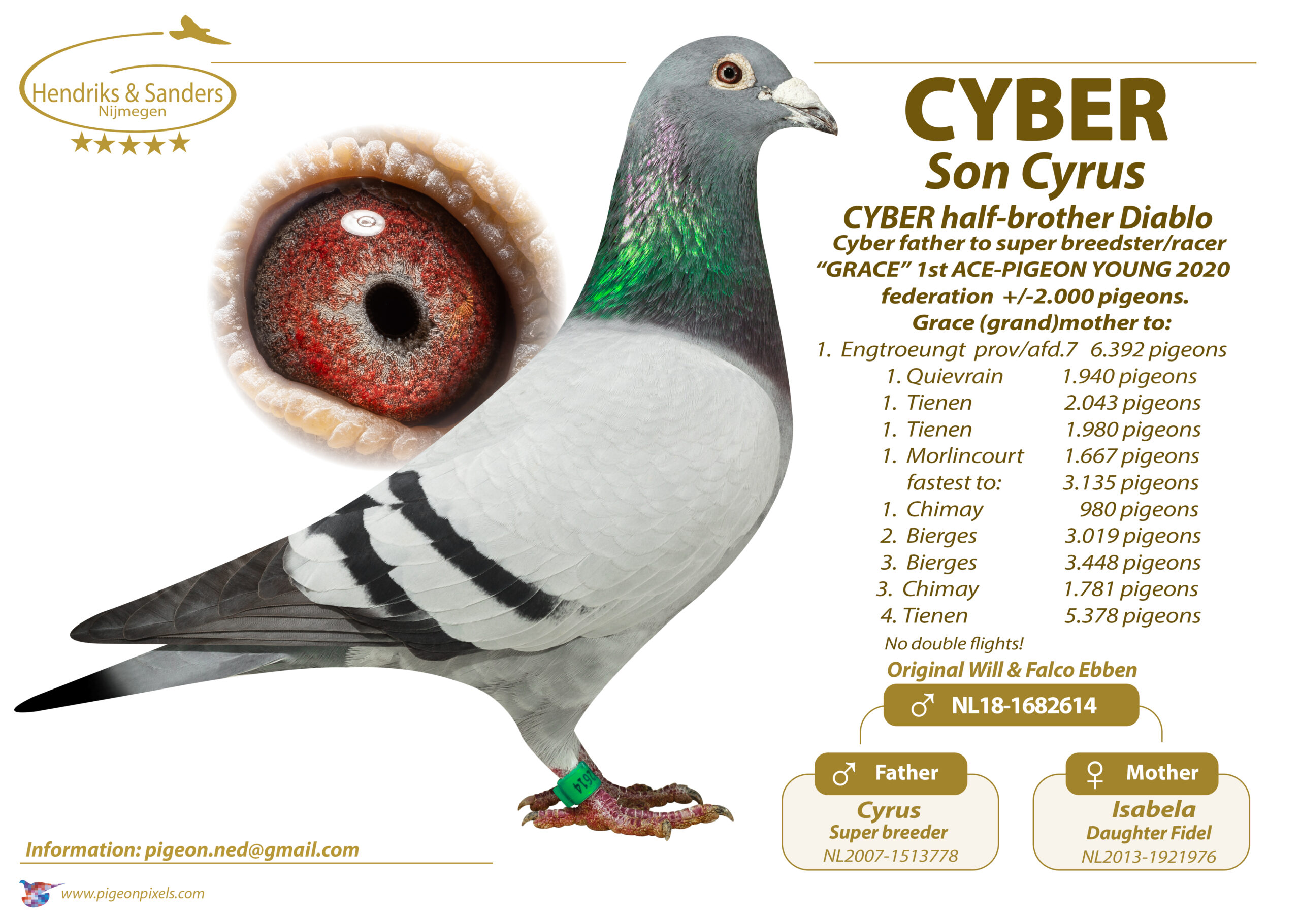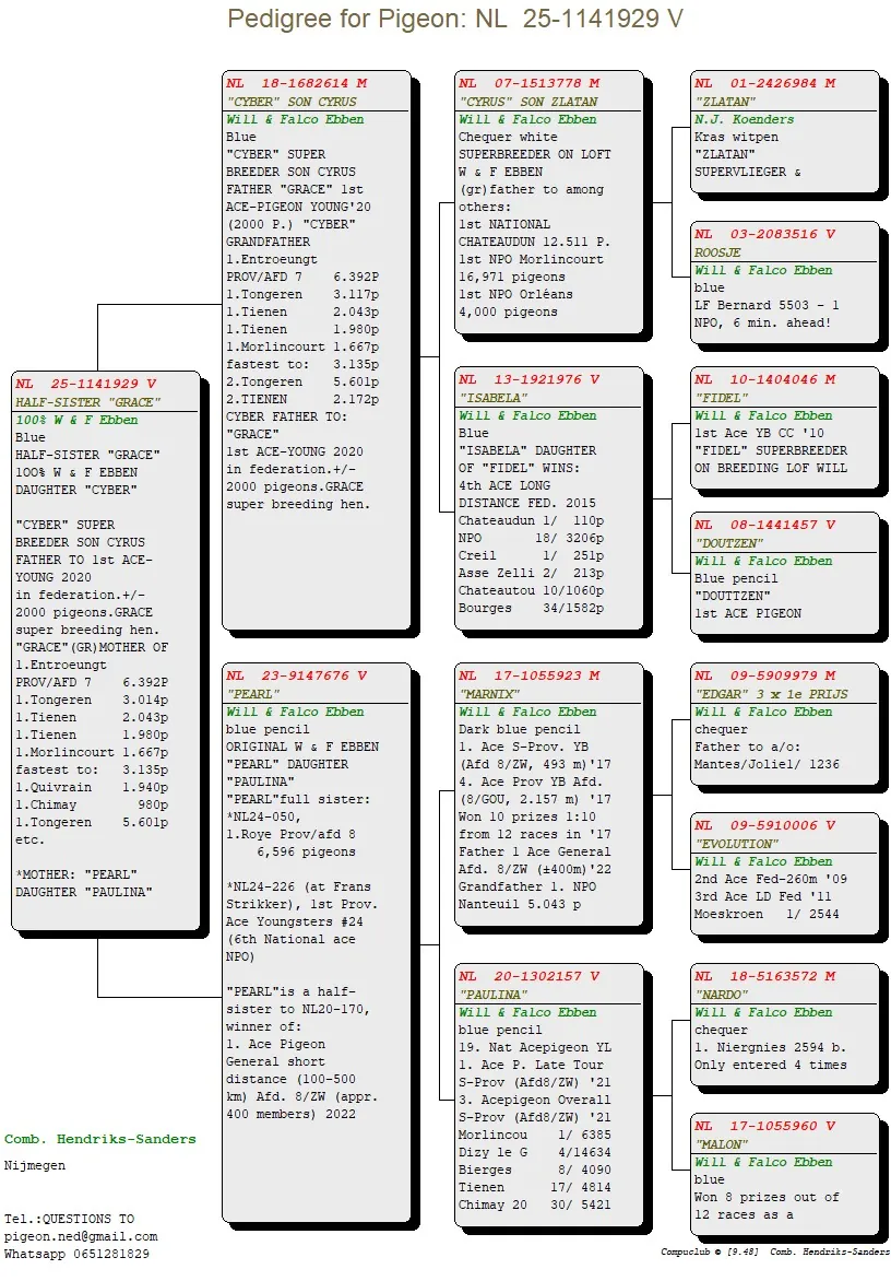Uit: ”Cyber”, vader ”Grace”, 1. Asduif Jonge Duiven, gr-vader 1. Prov. 6.392 d., 1.-3.117 d., 1.-2.043 d., 1.-1.980 d., 1.-1.667 d., 2.-5.601 d., zoon ”Cyrus” x ”Pearl”, zus 1. Prov. Roye 6.596 d., 1/2 zus 1. Prov. Asduif, 6. Nat. Asduif