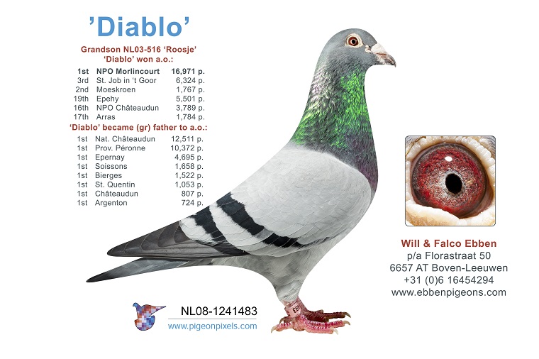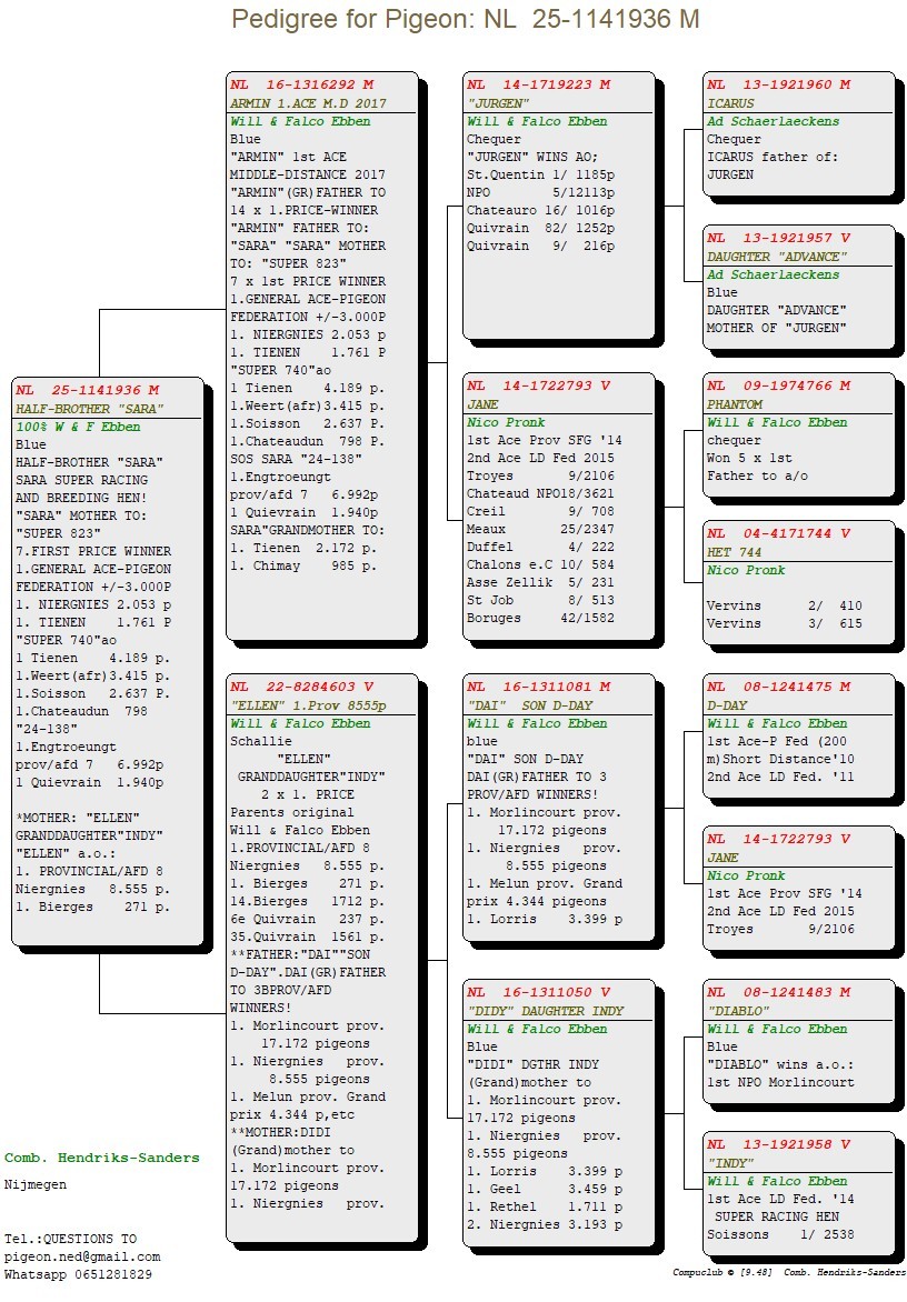 Uit: ”Armin”, 1. Asduif Midfond, vader & gr-vader 14x 1. Prijs, 1. Asduif Federatie Generaal, 1. Prov. 6.392 d., 1.-4.189 d., 1.-2.053 d., 1.-1.761 d. x ”Ellen”, 1. Prov. 8.555 d., 1.-271 d., 6.-237 d., 14.-1.712 d., uit dochter ”Diablo” & ”Indy”