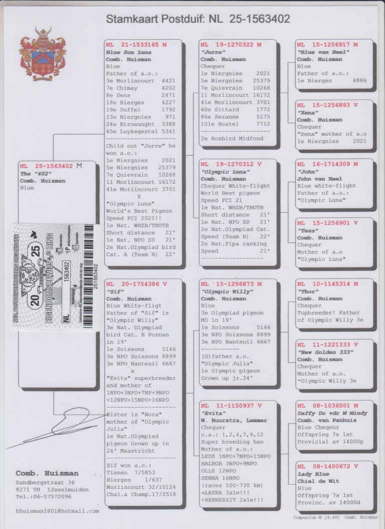 Uit: ”Blue Son Luna”, vader 3.-4.421 d., 7.-4.202 d., 8.-2.471 d., zoon ”Olympic Luna”, 2x 1. Nat. Asduif & 2. Olympiade duif x ”Sif”, 1.-637 d., 7.-5.853 d., 17.-2.518 d., 32.-10.124 d., dochter ”Olympic Willy”, 3. Olympiade duif