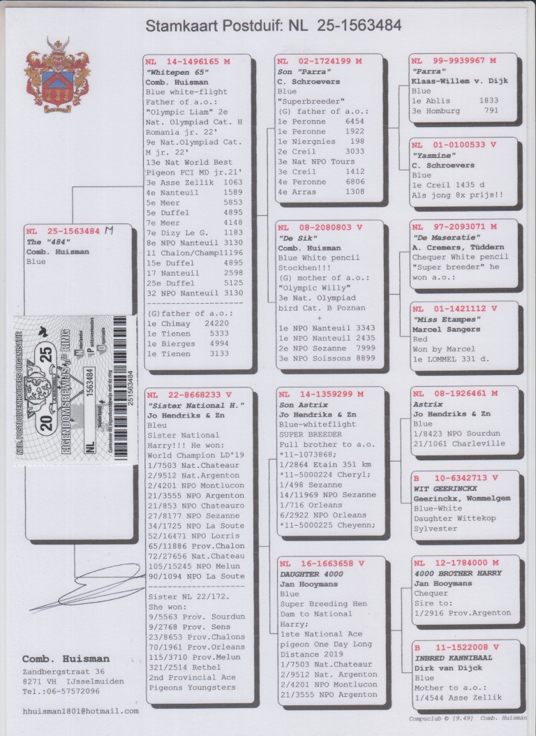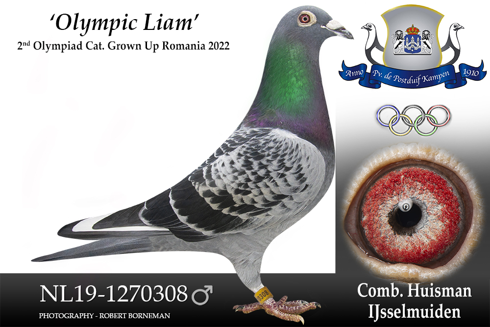Uit: ”Whitepen 65”, vader ”Olympic Liam”, 2. Olympiade duif Cat. Grown Up, vader & gr-vader 1.-24.220 d., 1.-5.333 d., 1.-4.994 d., 1.-3.133 d. x ”Sister Nat. Harry”, zus ”National Harry”, 1. Int. Asduif Dagfond FCI