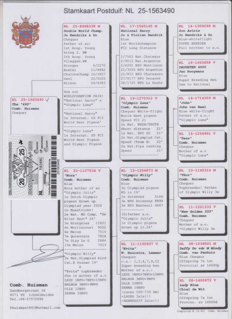 Uit: ”Double World Champ.”, vader 2x 1. Asduif Jonge Duiven, zoon ”National Harry” & ”Olympic Luna” x ”Nora”, moeder ”Olympic Julia”, 1. Olympiade duif Cat. Grown Up, 2. Nat. Asduif Midfond, dochter ”Olympic Willy”
