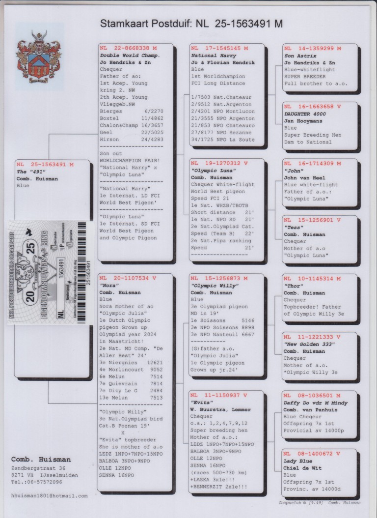 Uit: ”Double World Champ.”, vader 2x 1. Asduif Jonge Duiven, zoon ”National Harry” & ”Olympic Luna” x ”Nora”, moeder ”Olympic Julia”, 1. Olympiade duif Cat. Grown Up, 2. Nat. Asduif Midfond, dochter ”Olympic Willy”