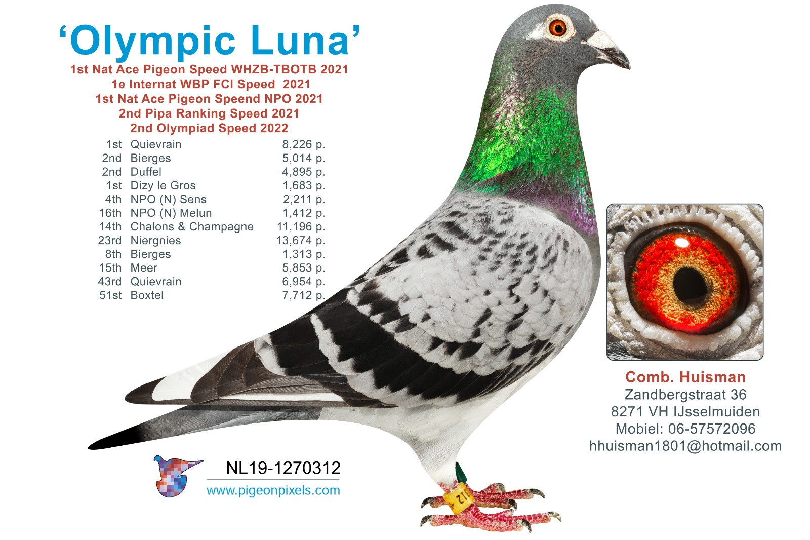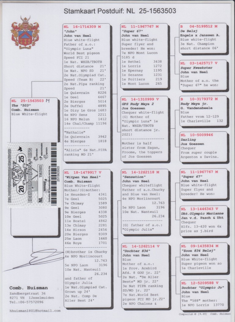 Uit: ”John”, vader ”Olympic Luna”, 1. Int. Asduif Sprint FCI, 1. Nat. Asduif WHZB, 1. Nat. Asduif NPO, 2. Olympiade duif Cat. Sprint x ”Witpen van Heel”, moeder & gr-moeder 1.-4.341 d., 7.-5.025 d., 7.-1.589 d., 9.-3.080 d.