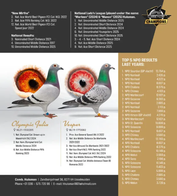 In de laatste seizoenen brachten de Huisman-duiven meerdere Olympiadeduiven en Nationale Asduiven voort, naast talloze teletekstnoteringen en overwinningen tegen duizenden duiven.