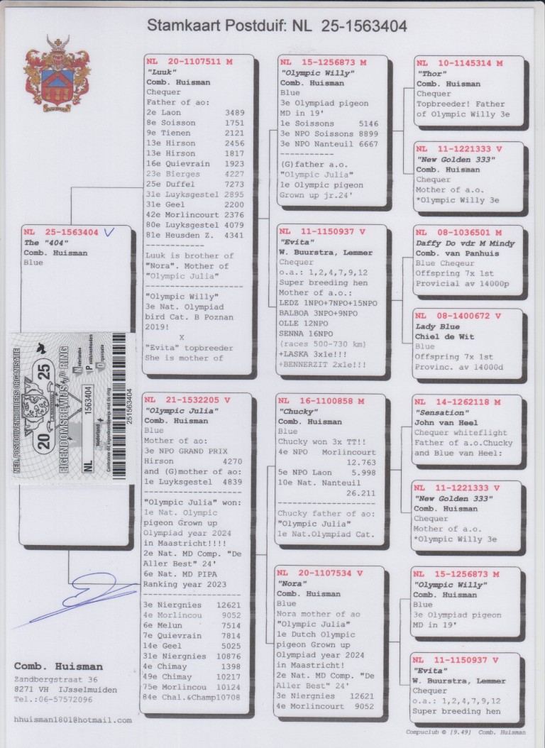 Uit: ”Luuk”, vader 2.-3.489 d., 8.-1.751 d., 9.-2.121 d., zoon ”Olympic Willy” x ”Olympic Julia”, 1. Olympiade Cat. Grown Up, 2. & 6. Nat. Asduif, 3.-12.621 d., 4.-9.052 d., 6.-7.514 d., moeder 3. NPO 4.270 d., gr-moeder 1.-4.839 d.