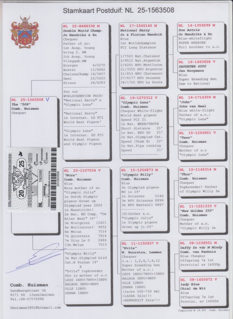 Uit: ”Double World Champ.”, vader 2x 1. Asduif Jonge Duiven, zoon ”National Harry” & ”Olympic Luna” x ”Nora”, moeder ”Olympic Julia”, 1. Olympiade duif Cat. Grown Up, 2. Nat. Asduif Midfond, dochter ”Olympic Willy”