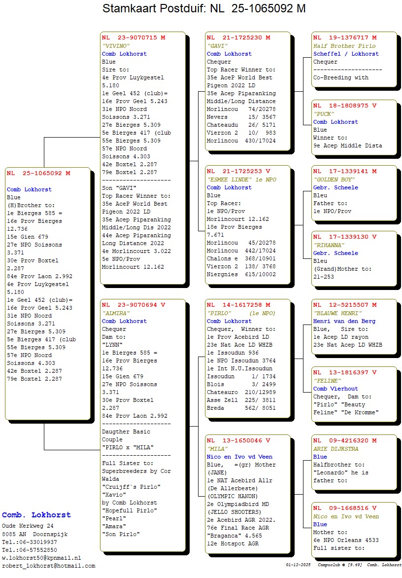 Uit: ”Vivivo”, vader 1.-452 d., 4. Prov. 5.180 d. x ”Almira”, moeder 1.-585 d., zus ”Xavio”, vader ”Jane”, 1. Nat. Asduif Allround, ”Olympic Hakon”, 2. Olympiade duif Cat. Midfond, dochter ”Pirlo”, 1. NPO Issoudun 3.764 d.