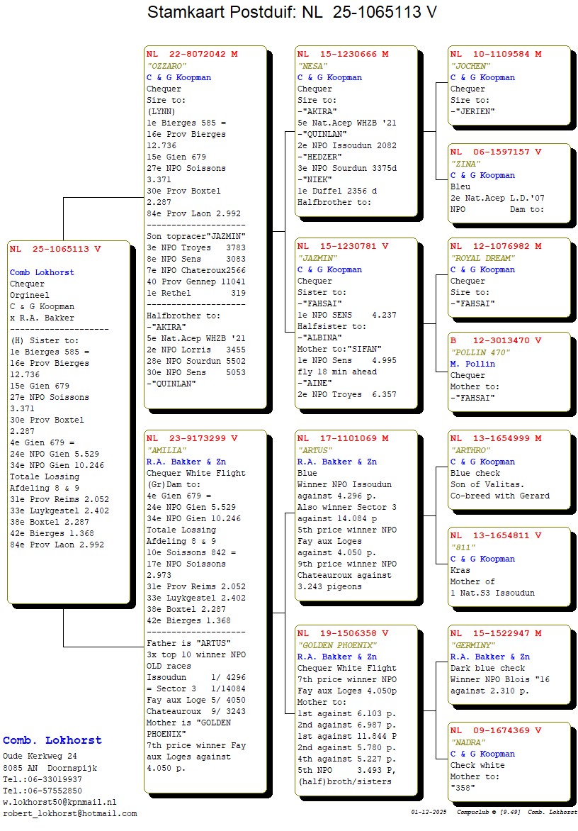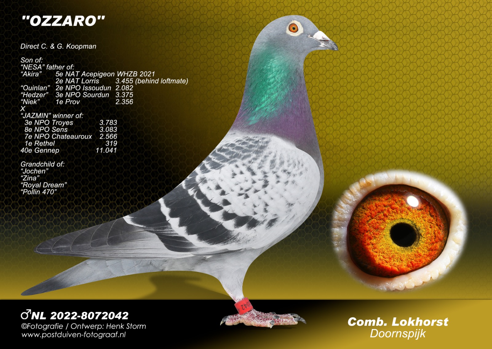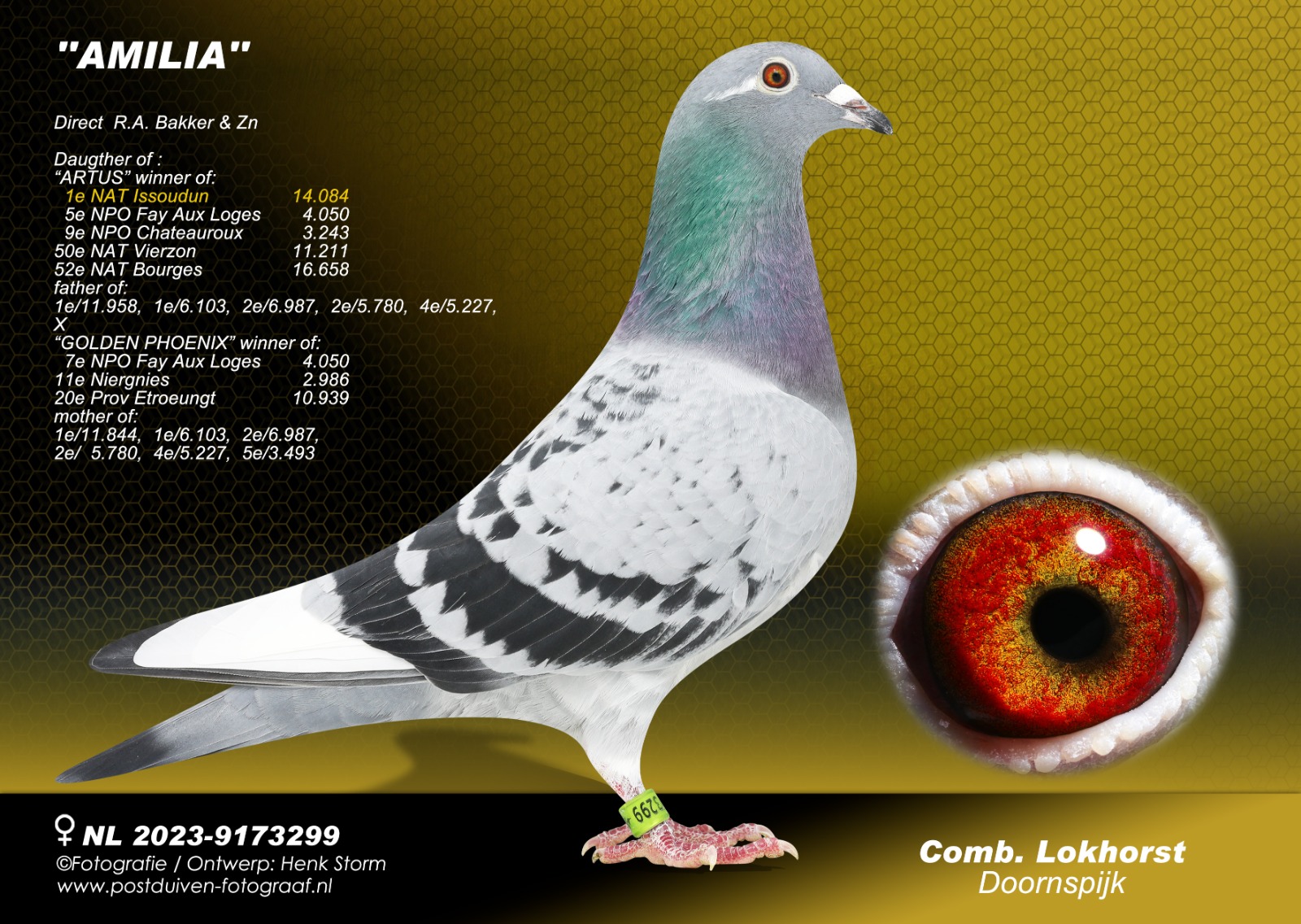 Uit: ”Ozzaro”, vader 1.-585 d., 16. Prov. 12.736 d., 27. NPO 3.371 d., 30. Prov. 2.287 d., 1/2 broer ”Akira”, 5. Nat. Asduif WHZB x ”Amilia”, dochter ”Artus”, 1. Nat. Issoudun 14.084, dtr. ”Golden Phoenix”, Unieke kweker