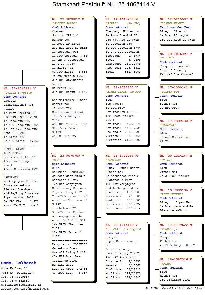 Uit: ”Golden Savio = son Pirlo”, 1. NPO Issoudun 3.764 d., gr-vader ”Jane”, 1. Nat. Asduif Allround, ”Olympic Hakon”, 2. Olympiade duif Cat. Midfond, zoon ”Esmee Linde”, 1. NPO 12.162 d. x ”Demi”, dtr. ”Armindo”, 2. SProv. Asd.