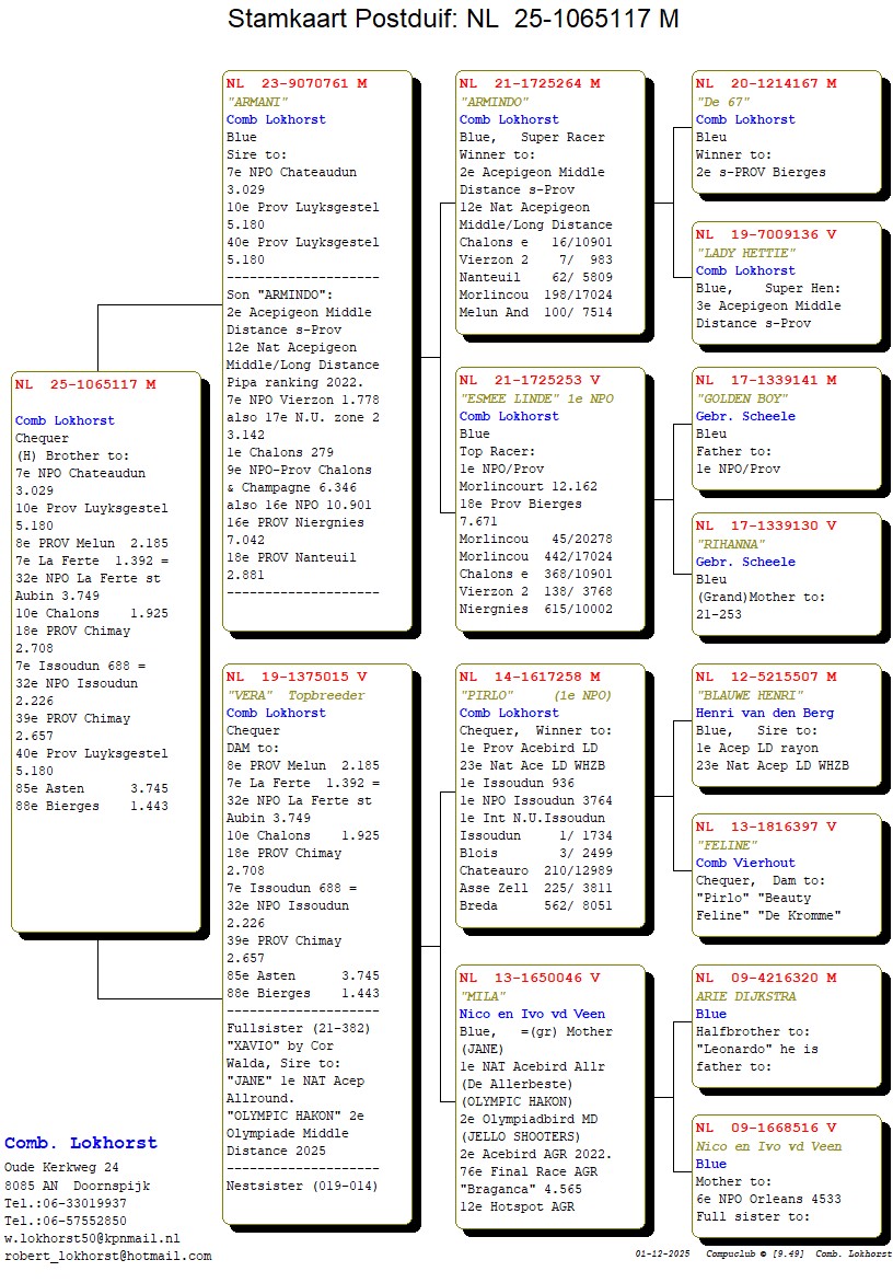 Uit: ”Armani”, vader 7. NPO 3.029 d., 10. Prov. 5.180 d., zoon ”Armindo” & ”Esmee Linde”, 1. NPO Morlincourt 12.162 d. x ”Vera”, moeder 7.-1.392 d., 8. Prov. 2.185 d., 10.-1.925 d., zus kweker ”Jane”, 1. Nat. Asduif, ”Olympic Hakon”