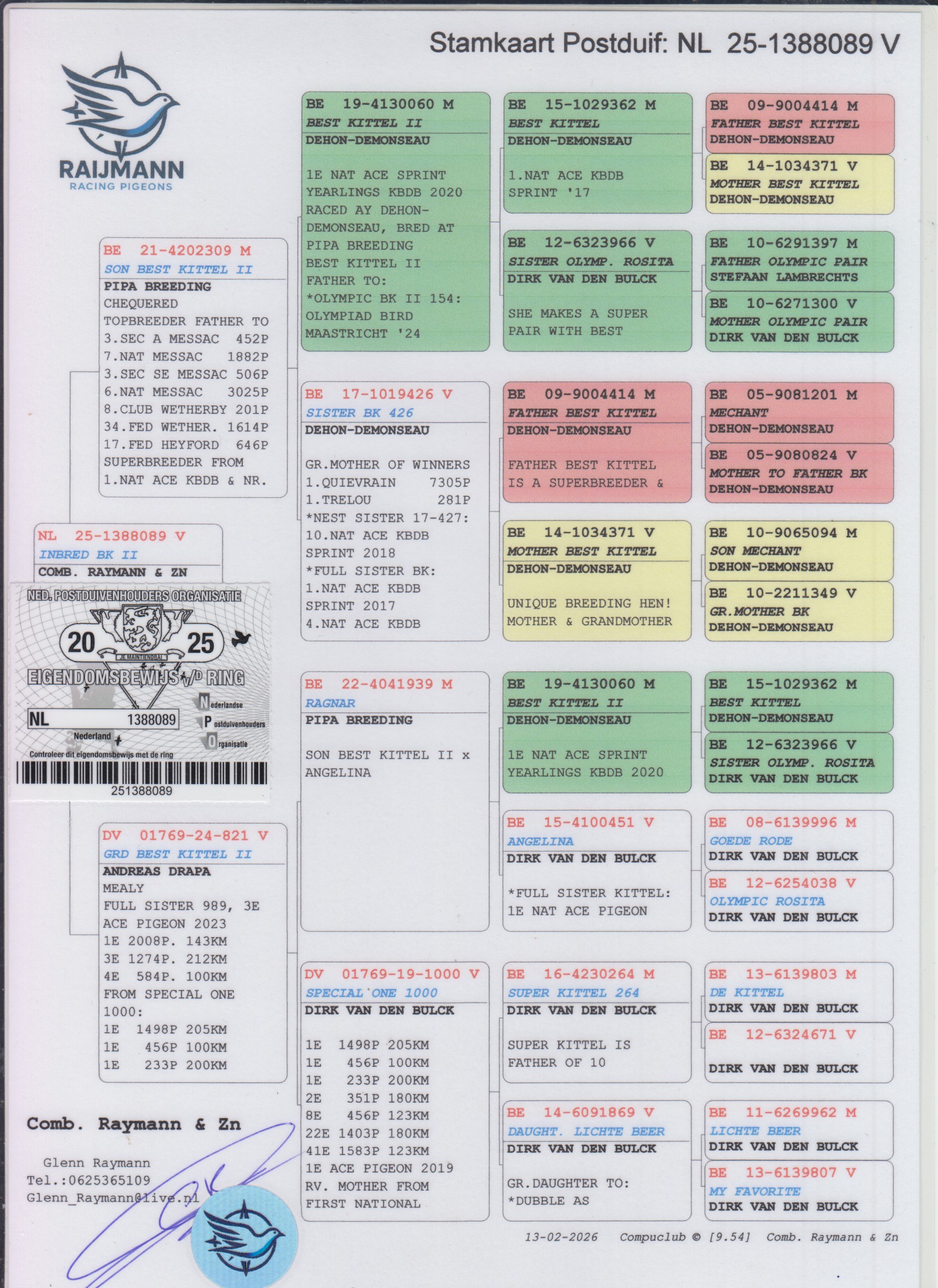 Uit: ”Son Best Kittel II”, vader 3.-506 d., 3.-452 d., 6. Nat. 3.025 d., 7. Nat. 1.882 d., zoon ”Best Kittel II”, 1. Nat. Asduif Sprint KBDB & Unieke Superkweker x ”Grd. Best Kittel II”, dochter ”Special One 1000”, 1.-1.498 d. & 3x 1. Prijs