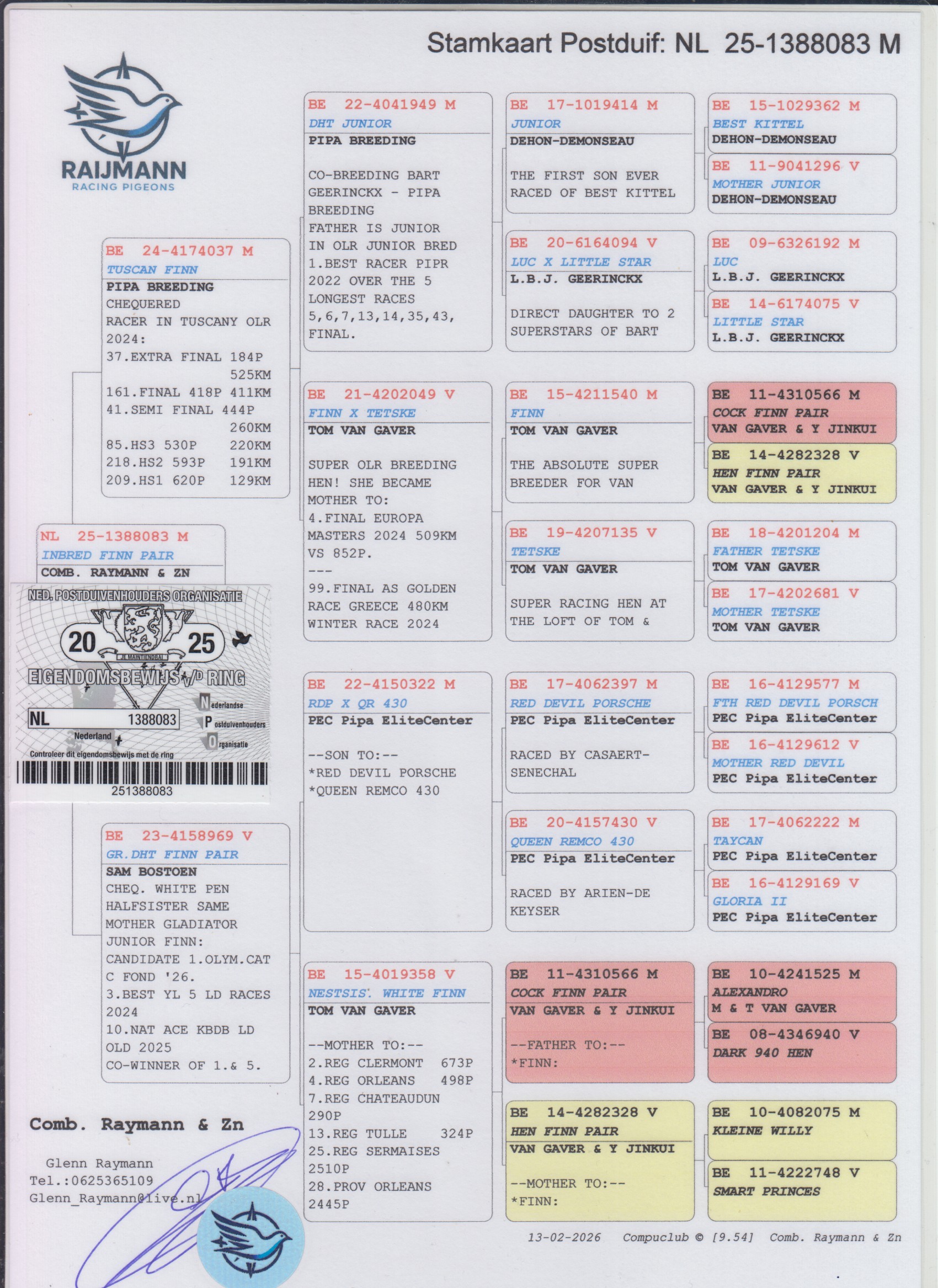 Uit: ”Tuscan Finn”, 37. Extra Finale & 41. Halve Finale OLR Tuscany OLR, uit zoon ”Junior”, 1. Nat. Asduif KBDB, uit dtr. ”Finn” & ”Tetske”, Superkoppel Tom van Gaver x ”Grdtr. Finn Pair”, uit nestzus ”Finn”, Stamvader van Gaver