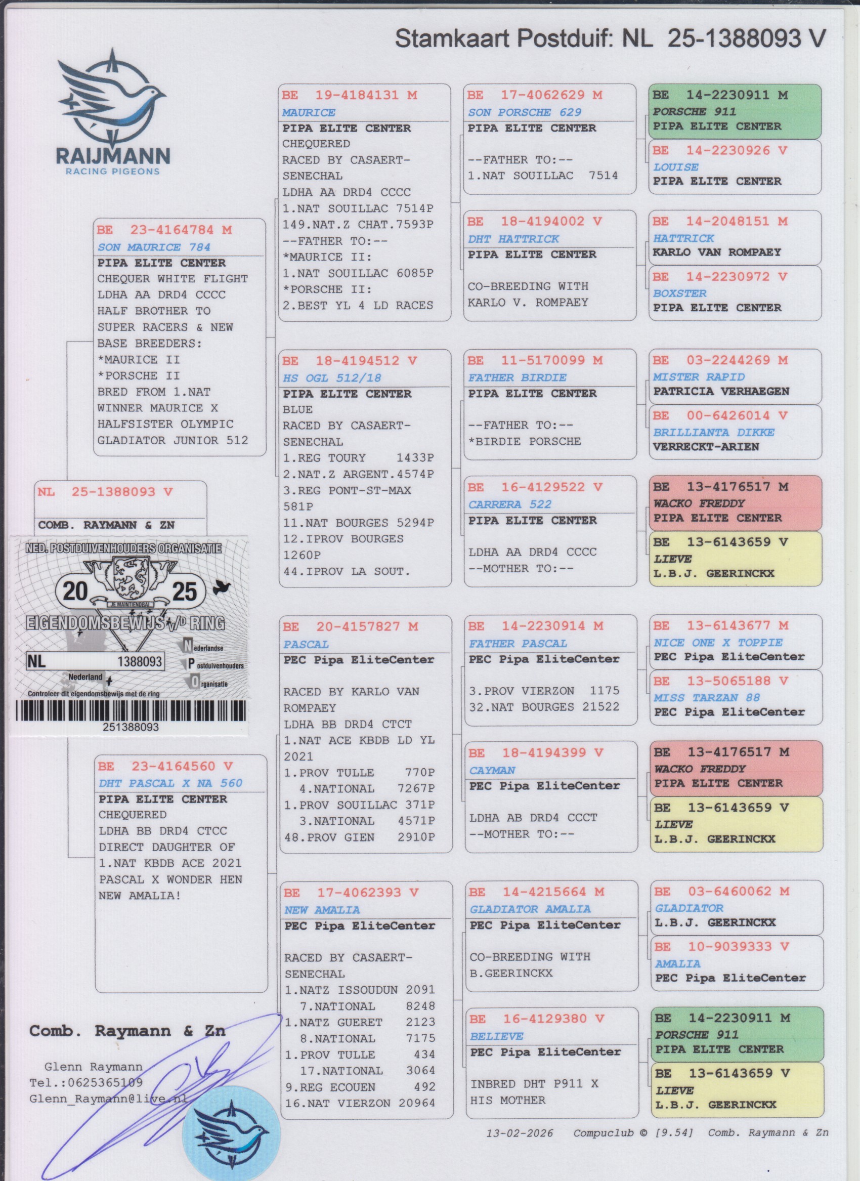 Uit: ”Son Maurice 784”, zoon ”Maurice”, 1. Nat. Souillac 7.514 d. x ”Dht. Pascal x Na 560”, dochter ”Pascal”, 1. Nat. Asduif Fond KBDB Jaarlingen & ”New Amalia”, 1. Nat. Zone Issoudun 2.091 d., 1. Nat. Zone Gueret 2.123 d.