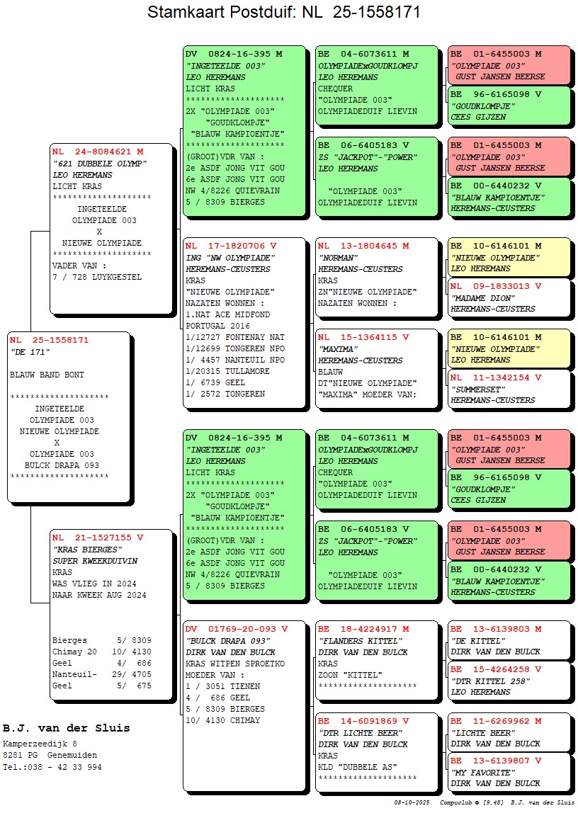 Uit: ”621 Dubbele Olympiade”, 2x inteelt ”Olympiade 003”, Olympiade duif Leo Heremans x ”Kras Bierges”, 5.-8.309 d., 10.-4.130 d., etc., 2x inteelt ”Olympiade 003”, Olympiade duif Leo Heremans, lijn ”Kittel”, 1. Nat. Asduif