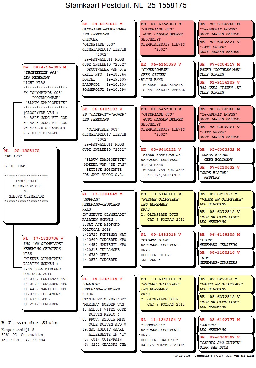 Uit: ”Ingeteelde 003”, uit zoon & dochter ”Olympiade 003”, Olympiade duif Leo Heremans x ”Ingeteelde Nieuwe Olympiade”, uit zoon & dochter ”Nieuwe Olympiade”, 2. Olympiade duif Cat. Jonge Duiven