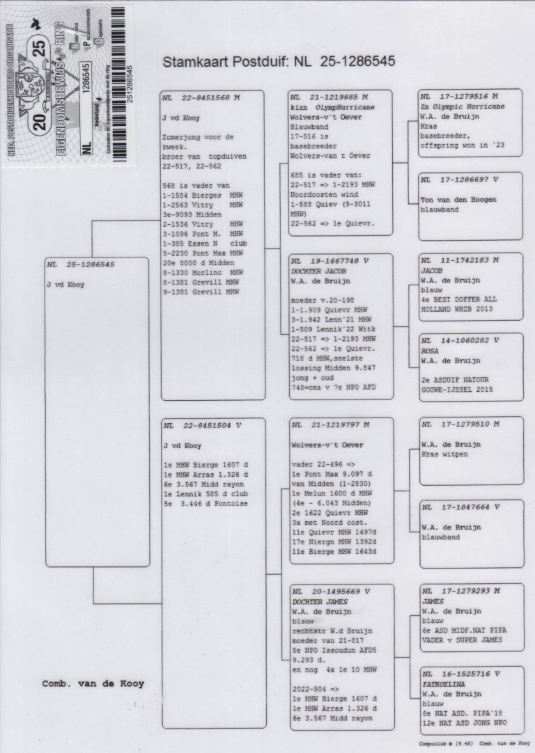 Hij komt uit NL17-1279516. Zoon “Olympic Hurricane”. W.A. de Bruijn.
