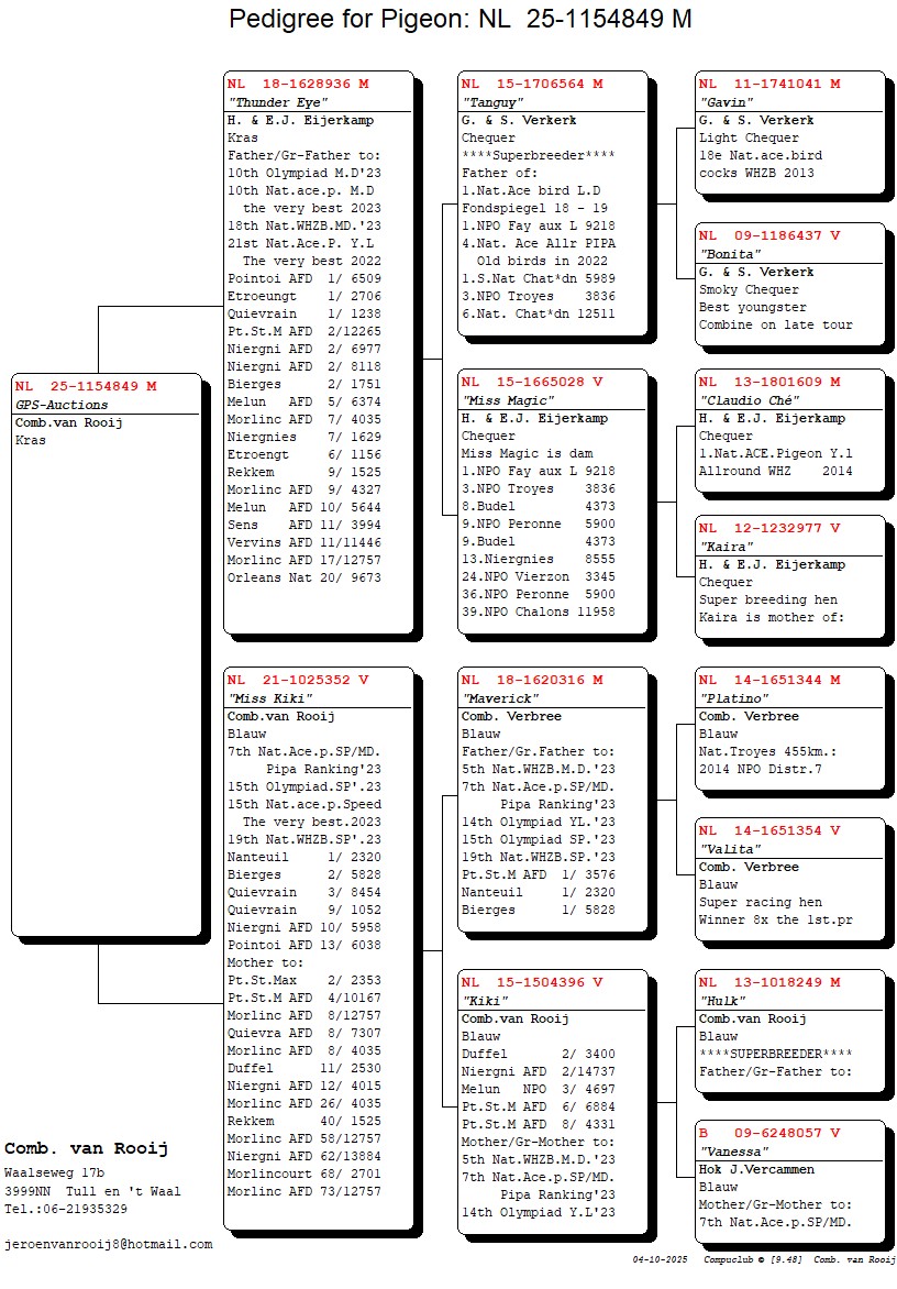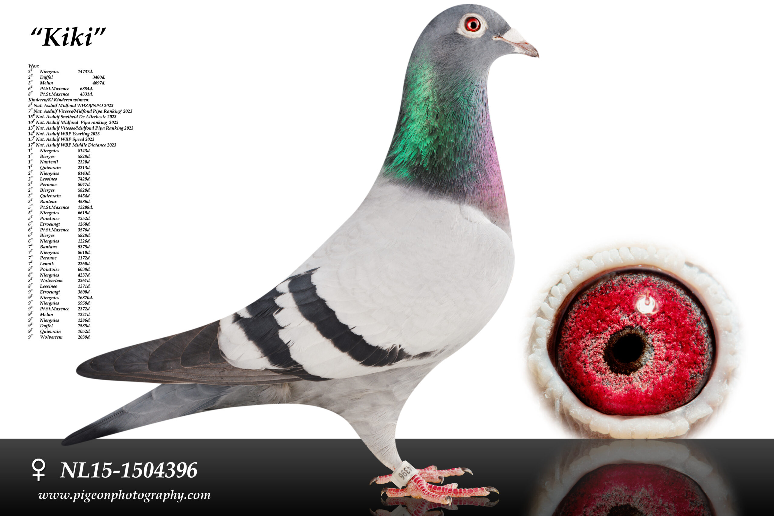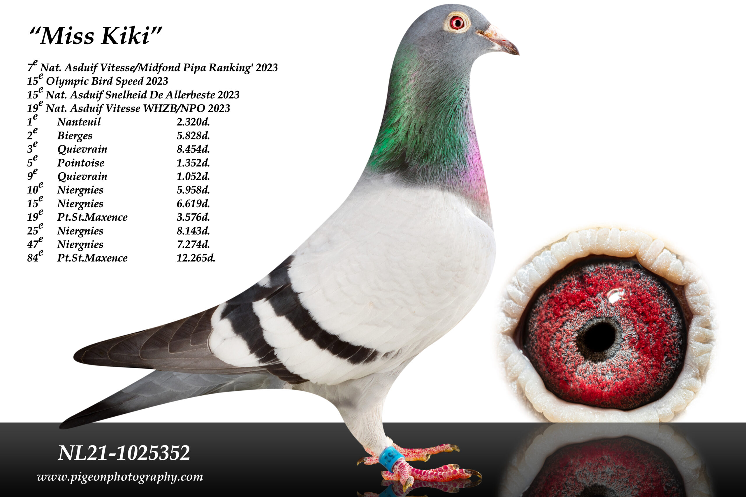 Uit: ”Thunder Eye”, vader & gr-vader 10. Olympiade, 1. Prov. 6.509 d., 1.-2.706 d., 1.-1.238 d., 2. Prov. 12.265 d., 2. Prov. 8.118 d., 2.-6.977 d. x ”Miss Kiki”, 7. Nat. Asduif, 1.-2.320 d., 2.-5.828 d., 3.-8.454 d., moeder 2.-2.353 d., 4. Prov. 10.167 d.