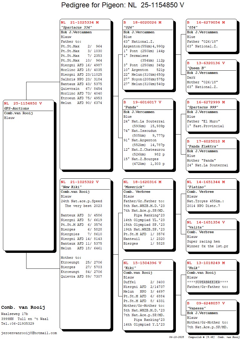 Uit: ”Spartacus 334”, Vercammen, vader 2.-964 d., 3.-1.030 d., 7.-2.353 d., 10.-964 d. x ”New Kiki”, 24. Nat. Asduif Sprint, 3. Prov. 4.586 d., 5. Prov. 6.619 d., 6.-5.828 d., 6. Prov. 3.576 d., 7.-8.610 d., 11. Prov. 5.375 d., 14. Prov. 8.143 d.