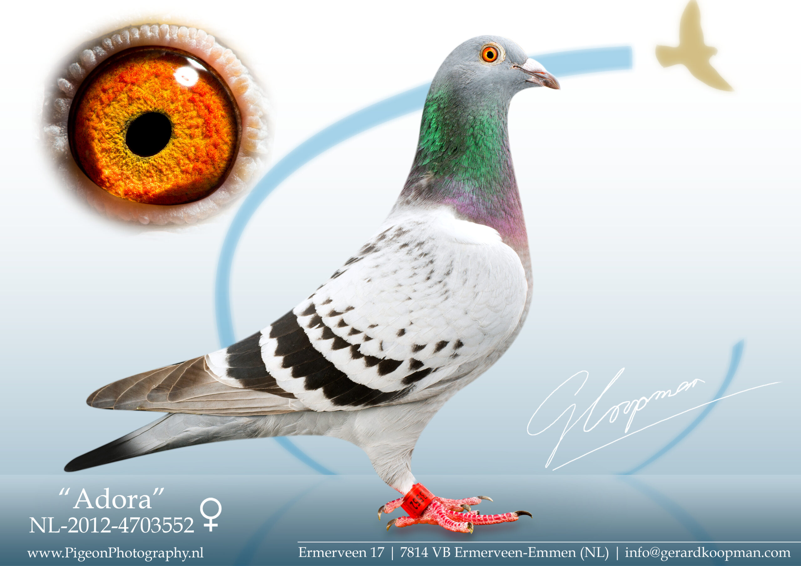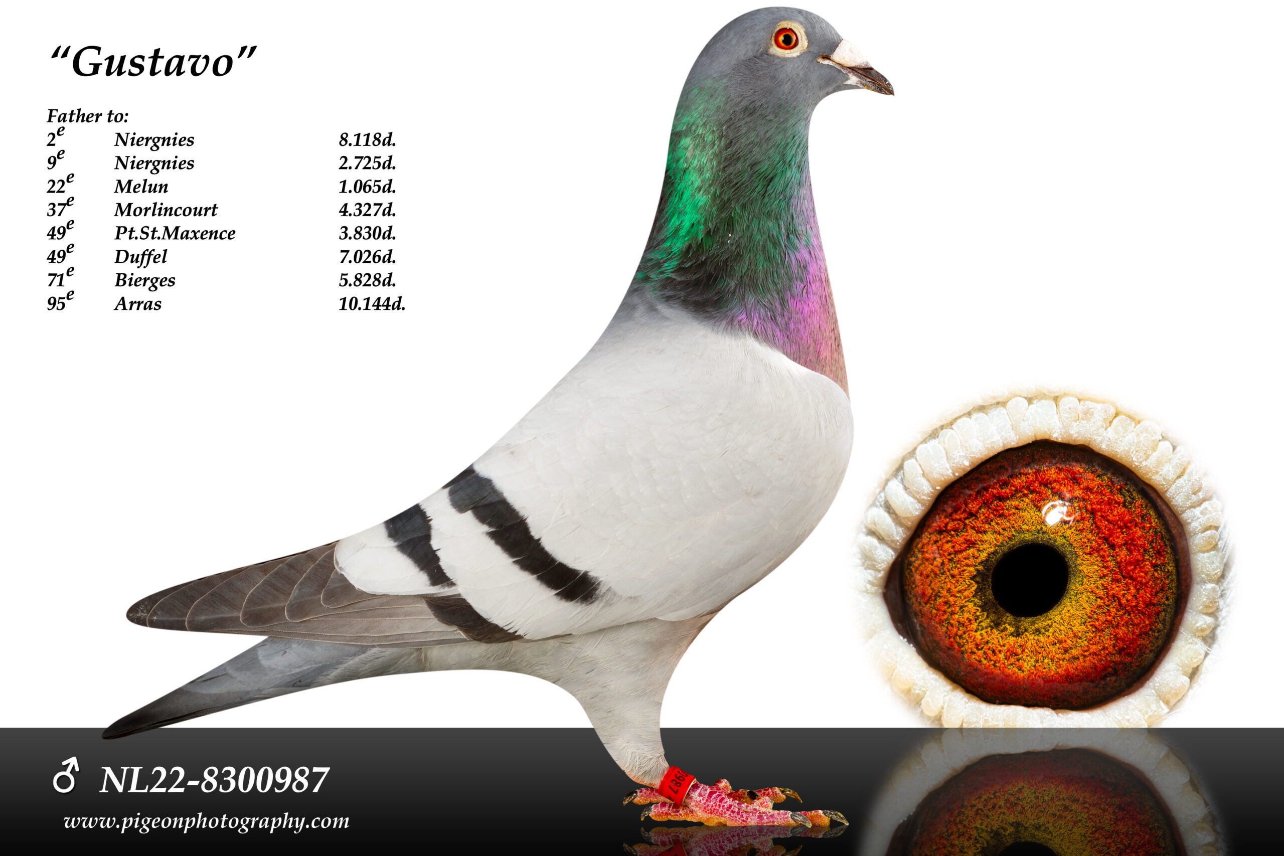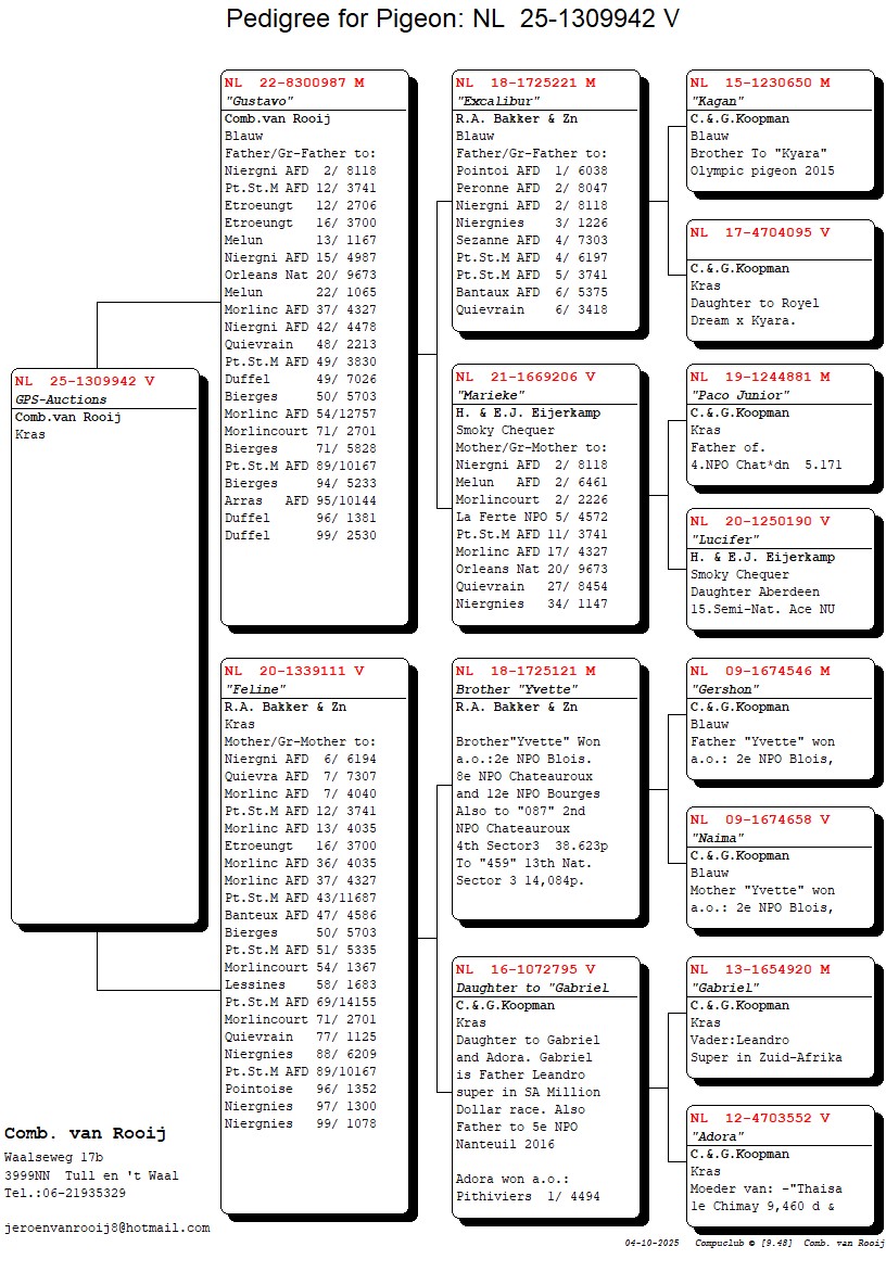 Uit: ”Gustavo”, vader & gr-vader 2. Prov. 8.118 d., 12. Prov. 3.741 d., 12.-2.706 d. x ”Feline”, moeder & gr-moeder 6. Prov. 6.194 d., 7. Prov. 7.307 d., 7. Prov. 4.040 d., 12. Prov. 3.741 d., 13. Prov. 4.035 d., 100% Koopman