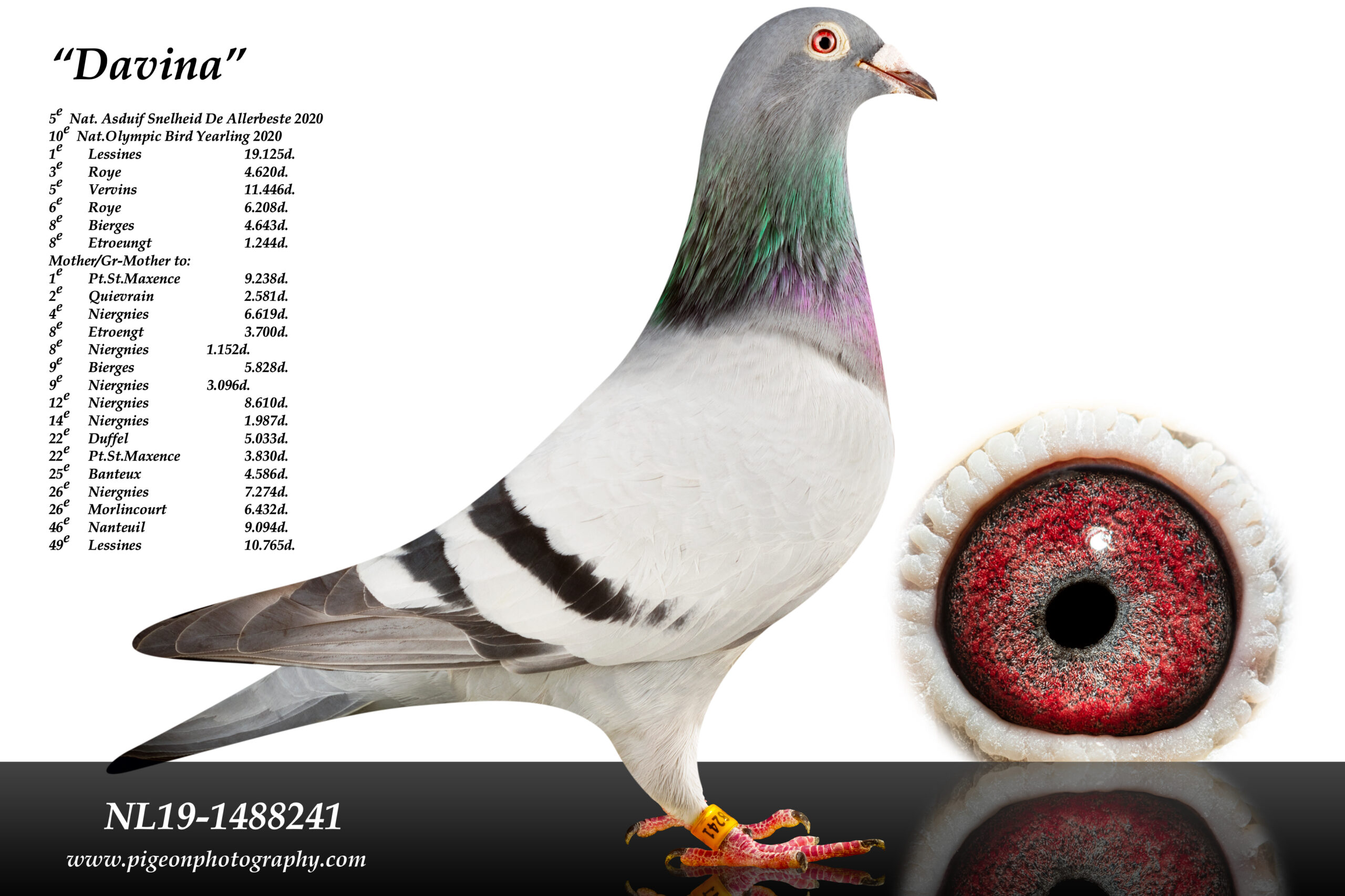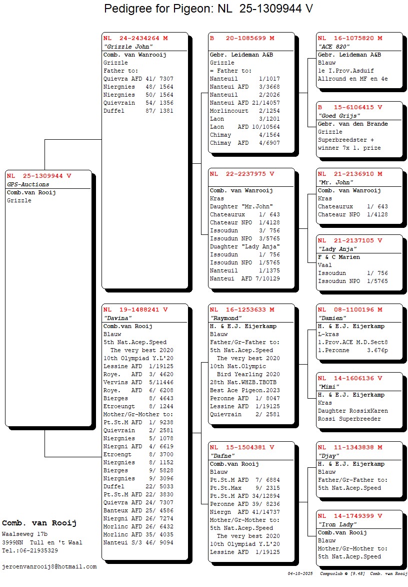 Uit: ”Grizzle John”, 1/2 broer 1.-1.017 d., uit zoon ”Goed Grijs”, 7x 1. Prijs & 1. NPO Laon 6.371 d. x ”Davina”, 5. Nat. Asduif Sprint, 1. Prov. 19.125 d., 3. Prov. 4.620 d., 5. Prov. 11.446 d., moeder & gr-moeder 1.-9.238 d., 2.-2.581 d.