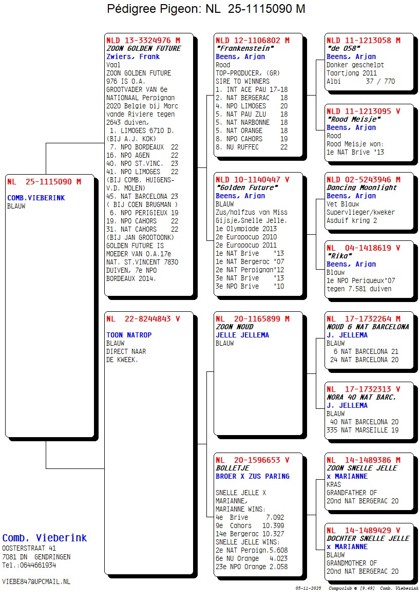 Uit: ”Zoon Golden Future 976”, gr-vader 1. Nat. Limoges 6.710 d., 6. Nat. Perpignan, 6. NPO Perigueux, 7. NPO Bordeaux, 45. Nat. Barcelona x ”De 843”, uit zoon ”Noud”, 6. & 24. Nat. Barcelona, inteelt ”Snelle Jelle”