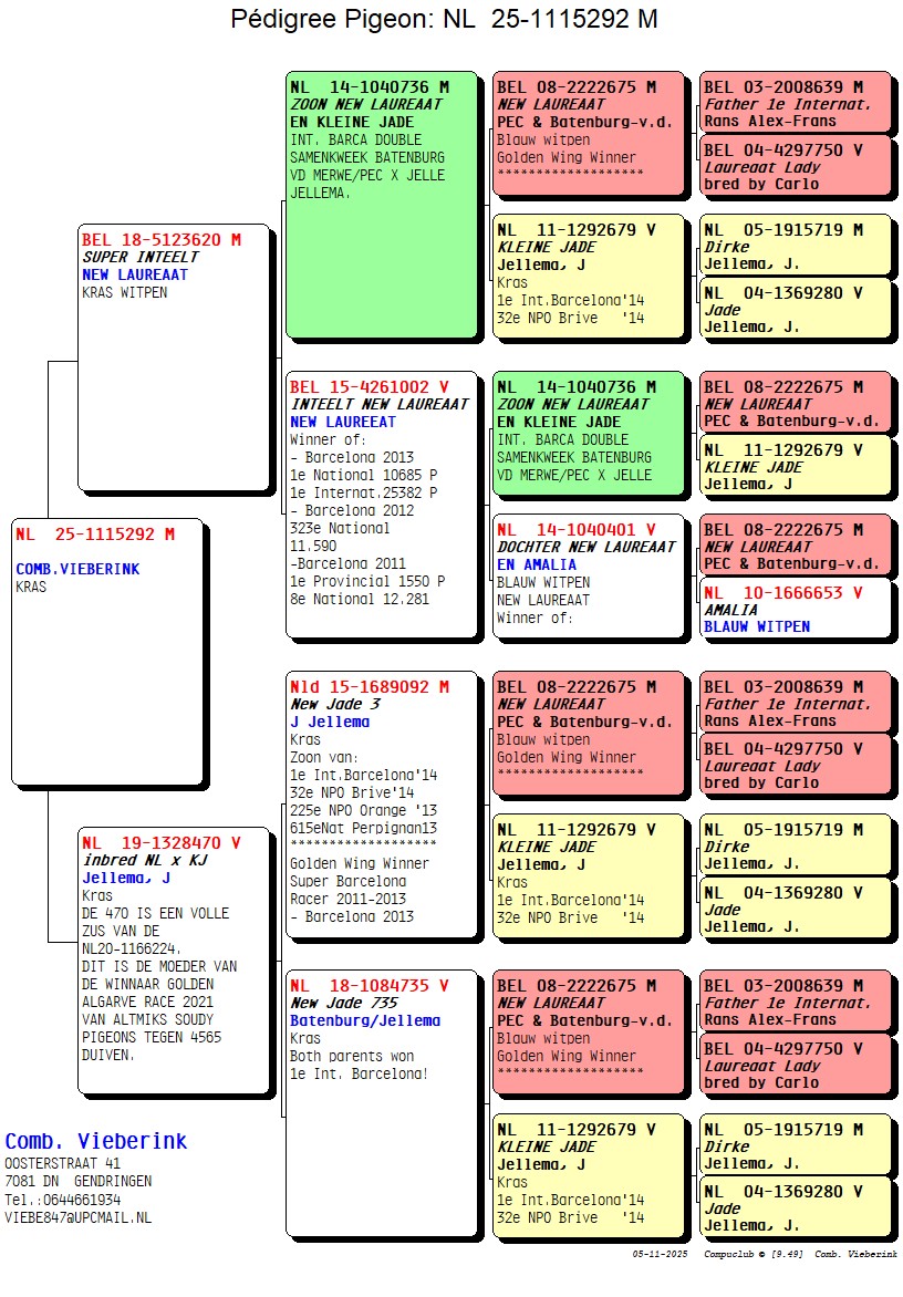 Uit: ”Super Inteelt”, uit zoon ”New Laureaat”, 1. Int. Barcelona 25.382 d., uit zoon ”Kleine Jade”, 1. Int. Barcelona 20.669 d. x ”Inbred NL x KJ”, uit zoon & dochter ”New Laureaat” & ”Kleine Jade”, beide 1. Int. Barcelona