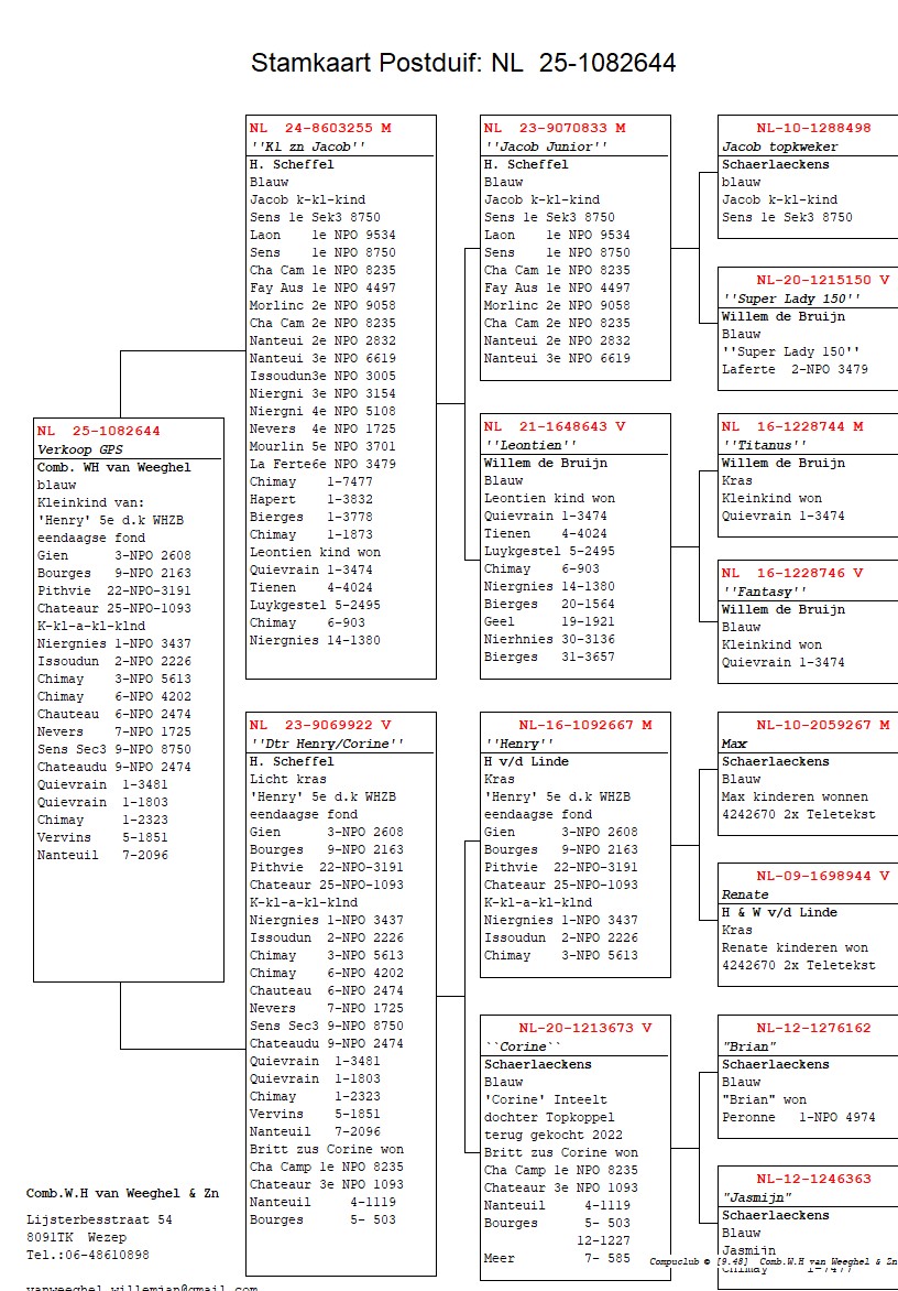 Uit: ”Klz. Jacob”, uit zoon ”Jacob”, nazaten winnen  1. NPO 9.534 d., 1. NPO 8.750 d., 1. NPO 8.235 d., 1. NPO 4.497 d., 1.-7.477 d., 1.-3.832 d., 1.-3.778 d., 1.-1.873 d. x ”Dtr. Henry”, dochter ”Henry”, 5. Nat. Asduif WHZB