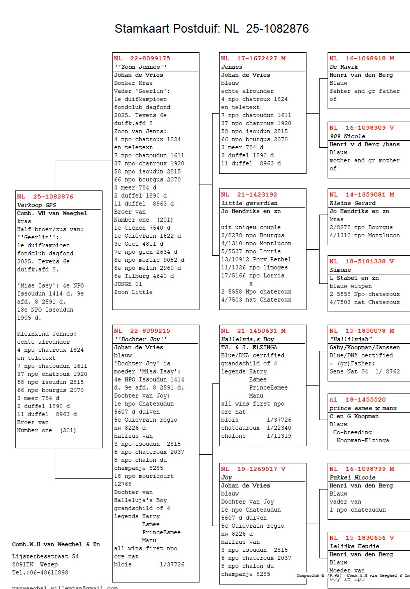 ”Half broer zus”, 1/2 zus ”Geerlin”, 1. Asduif Dagfond, 6. Prov. Asduif Dagfond, 1/2 zus ”Miss Issy”, 4. NPO Issoudun 1.414 d., uit: ”Zoon Jennes”, uit dochter ”Kleine Gerard” x ”Dochter Joy”, dochter ”Joy”, 1. NPO