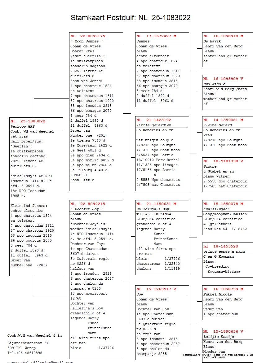”Half zus Geerlin”, 1/2 zus ”Geerlin”, 1. Asduif Dagfond, 6. Prov. Asduif Dagfond, 1/2 zus ”Miss Issy”, 4. NPO Issoudun 1.414 d., uit: ”Zoon Jennes”, uit dochter ”Kleine Gerard” x ”Dochter Joy”, dochter ”Joy”, 1. NPO