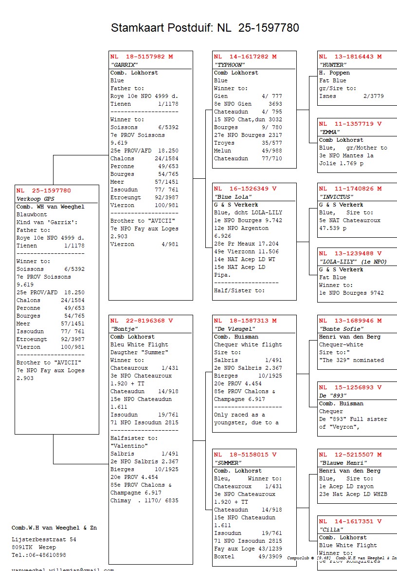 ”De 780”, 1/2 zus 1. Tienen 1.178 d., 10. NPO Roye 4.999 d., uit: ”Garrix”, 7. Prov. Soissons 9.619 d., 24. Chalons 1.584 d., uit dochter ”Lola-Lily”, 1. NPO Bourges 9.742 d. x ”Bontje”, dochter ”De Vleugel”, 2. NPO Salbris