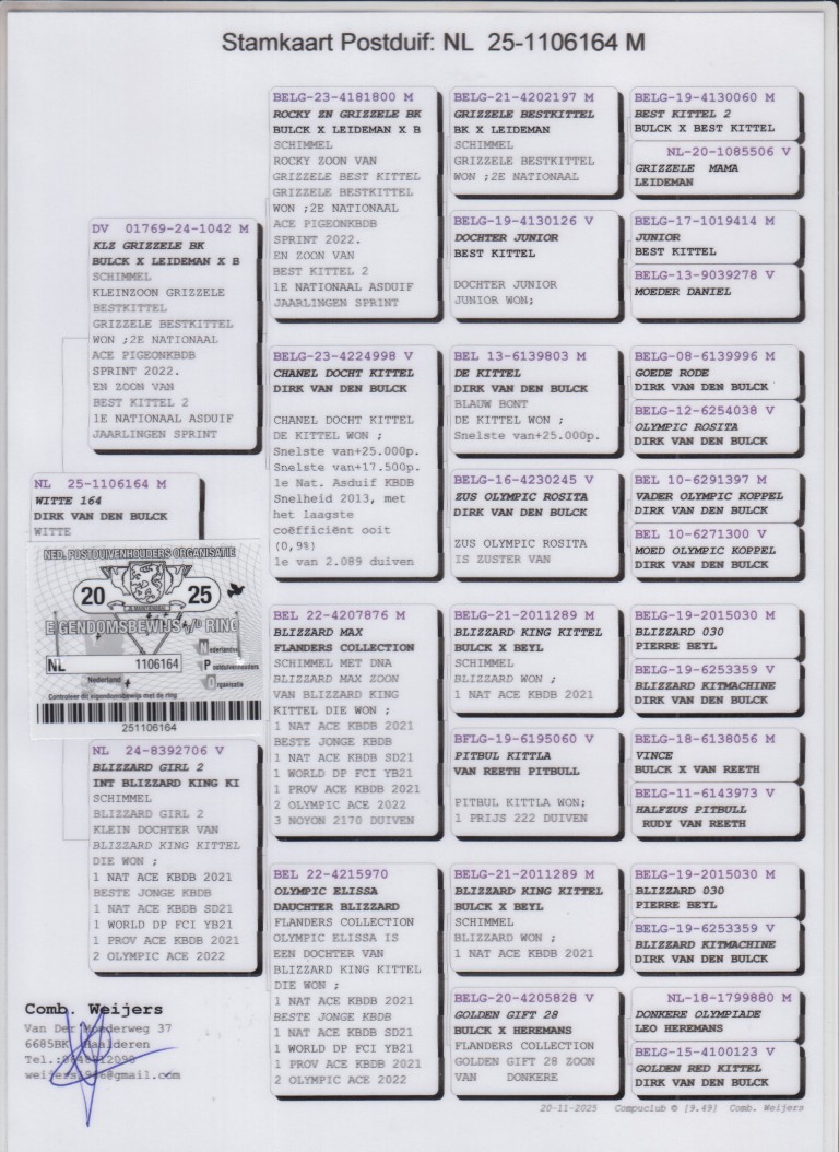 Uit: ”Klz. Grizzle BK”, uit zoon ”Grizzle Best Kittel”, uit dochter ”Kittel” x ”Blizzard Girl 1”, uit zoon & dochter ”Blizzard King Kittel”, 1. Nat. Asduif Sprint KBDB & vader ”Unicum”, 1. Nat. Asduif Srint KBDB 2025