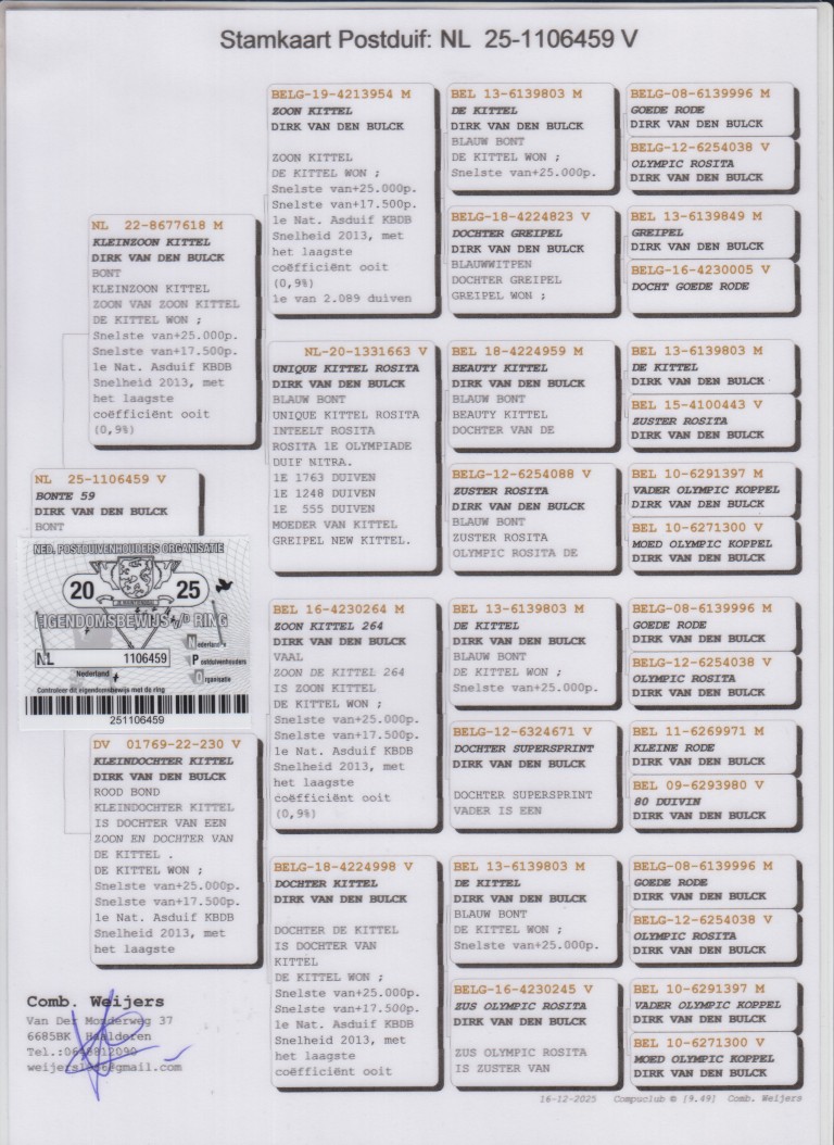Uit: ”Kleinzoon Kittel”, uit zoon & kld. ”Kittel”, 1. Nat. Asduif Sprint KBDB & zoon ”Olympic Rosita”, 1. Olympiade duif Cat. Sprint x ”Kleindochter Kittel”, uit zoon & dochter ”Kittel”, 1. Nat. Asduif Sprint KBDB