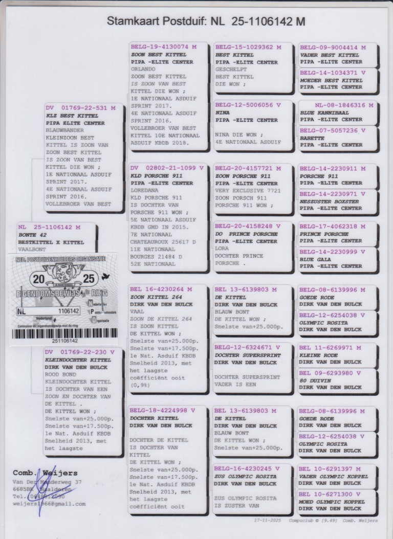 Uit: ”Klz. Best Kittel”, uit zoon ”Best Kittel”, 1. & 4. Nat. Asduif Sprint KBDB, uit kld. ”Porsche 911” & ”Prince Porsche” x ”Kld. Best Kittel”, uit dochter ”Best Kittel”, uit zoon ”Best Kittel II”, 1. Nat. Asduif Sprint KBDB