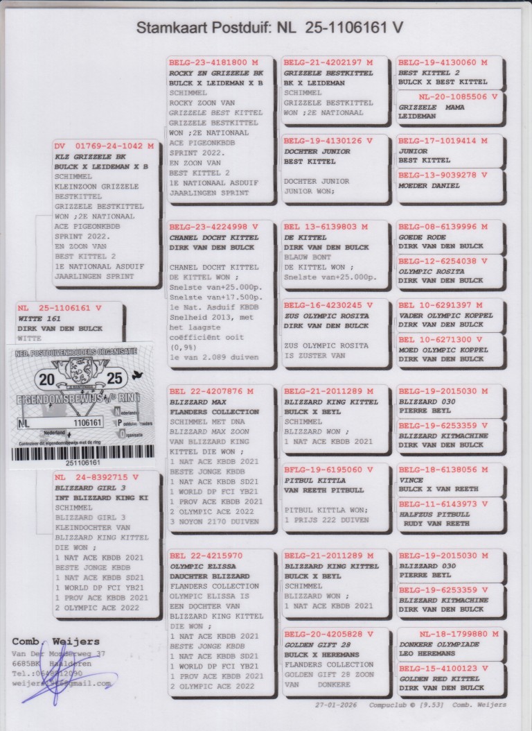 Uit: ”Klz. Grizzle BK”, uit zoon ”Grizzle Best Kittel”, uit dochter ”Kittel” x ”Blizzard Girl 3”, uit zoon & dochter ”Blizzard King Kittel”, 1. Nat. Asduif Sprint KBDB & vader ”Unicum”, 1. Nat. Asduif Srint KBDB 2025
