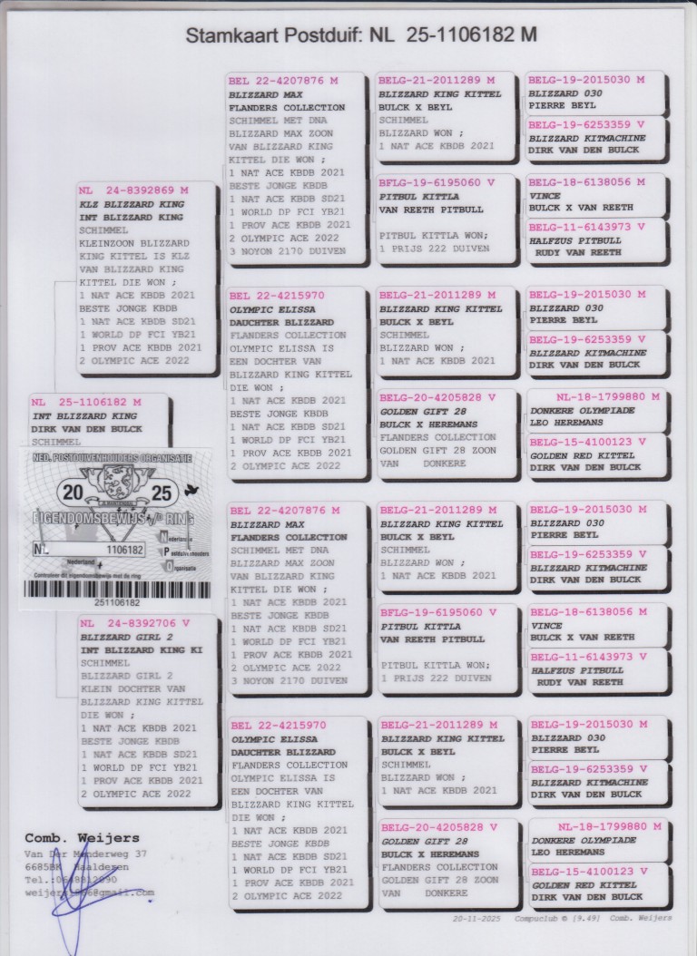 Uit: ”Dubbele klz. Blizzard”, uit zoon & dochter ”Blizzard King Kittel”, 1. Nat. Asduif Sprint KBDB & vader ”Unicum”, 1. Nat. Asduif Sprint KBDB 2025 x ”Blizzard Girl 2”, uit zoon & dochter ”Blizzard King Kittel”, 1. Nat. Asduif